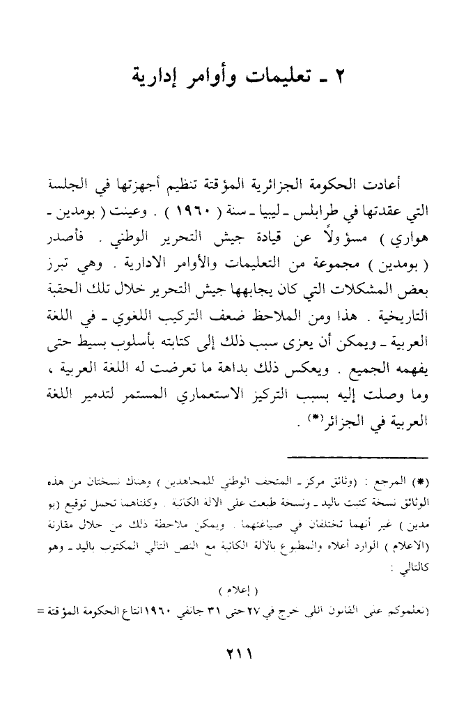 أعادت الحكومة الجزائرية المؤقتة تنظيم أجهزتها في الجلسة التي عقدتها في طرابلس - ليبيا - سنة (1960). وعينت (بومدين - هواري) مسؤولا عن قيادة جيش التحرير الوطني فأصدر (بومدين) مجموعة من التعليمات والأوامر الادارية. وهي تبرز بعض المشكلات التي كان يجابهها جيش التحرير خلال تلك الحقبة التاريخية. هذا ومن الملاحظ ضعف التركيب اللغوي - في اللغة العربية - ويمكن أن يعزى سبب ذلك إلى كتابته بأسلوب بسيط حتى يفهمه الجميع. ويعكس ذلك بداهة ما تعرضت له اللغة العربية، وما وصلت إليه بسبب التركيز الاستعماري المستمر لتدمير اللغة العربية في الجرائر (*).