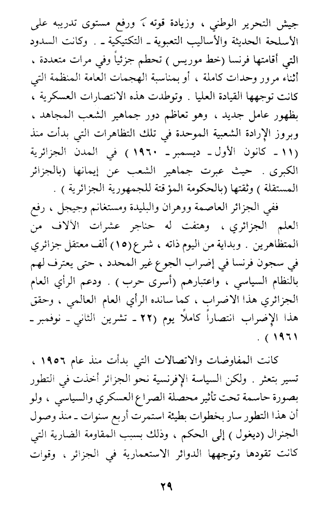 جيش التحرير الوطني، وزيادة قوته، ورفع مستوى تدريبه على الأسلحة الحديثة والأساليب التعبوية - التكتيكية -. وكانت السدود التي أقامتها فرنسا (خط موريس) تحطم جزئيا وفي مرات متعددة، أثناء مرور وحدات كاملة، أو بمناسبة الهجمات العامة المنظمة التي كانت توجهها القيادة العليا وتوطدت هذه الانتصارات العسكرية، بظهور عامل جديد، وهو تعاظم دور جماهير الشعب المجاهد، وبروز الإرادة الشعبية الموحدة في تلك التظاهرات التي بدأت منذ (11 - كانون الأول - ديسمبر - 1960) في المدن الجزائرية الكبرى. حيث عبرت جماهير الشعب عن إيمانها (بالجزائر المستقلة) وثقتها (بالحكومة المؤقتة للجمهورية الجزائرية).