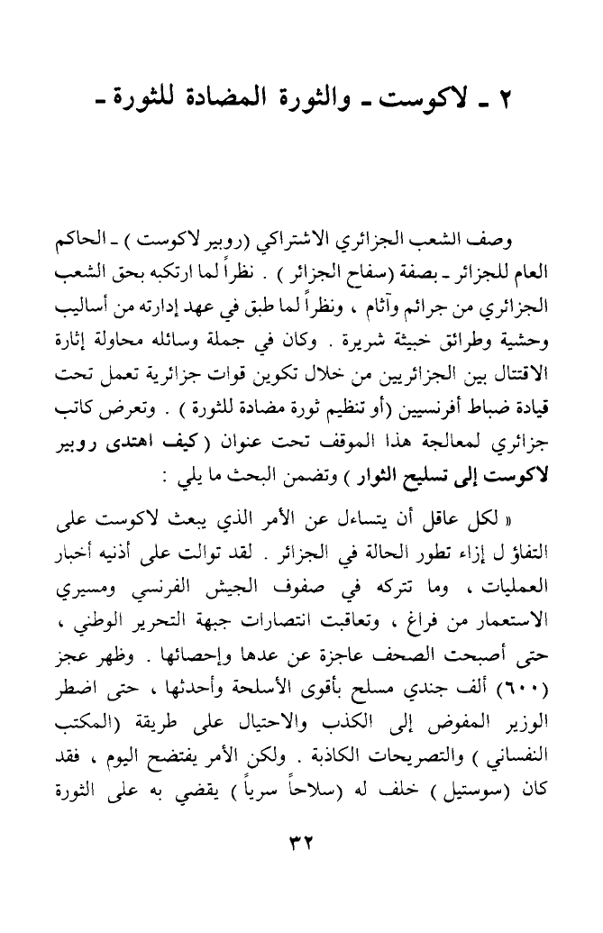 وصف الشعب الجزائري الاشتراكي (روبير لاكوست) - الحاكم العام للجزائر - بصفة (سفاح الجزائر). نظرا لما ارتكبه بحق الشعب الجزائري من جرائم وآثام، ونظرا لما طبق في عهد إدارته من أساليب وحشية وطرائق خبيثة شريرة. وكان في جملة وسائله محاولة إثارة الاقتتال بين الجزائريين من خلال تكوين قوات جزائرية تعمل تحت قيادة ضباط أفرنسيين (أو تنظيم ثورة مضادة للثورة) وتعرض كاتب جزائري لمعالجة هذا الموقف تحت عنوان (كيف اهتدى روبير لاكوست إلى تسليح الثوار) وتضمن البحث ما يلي:
