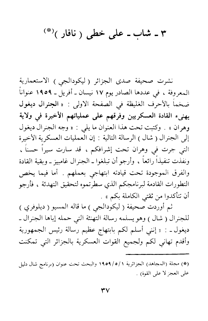 (*) مجلة (المجاهد) الجزائرية 1/ 5/ 1959 والبحث تحت عنوان (برنامج شال دليل على العجز لا على القوة).