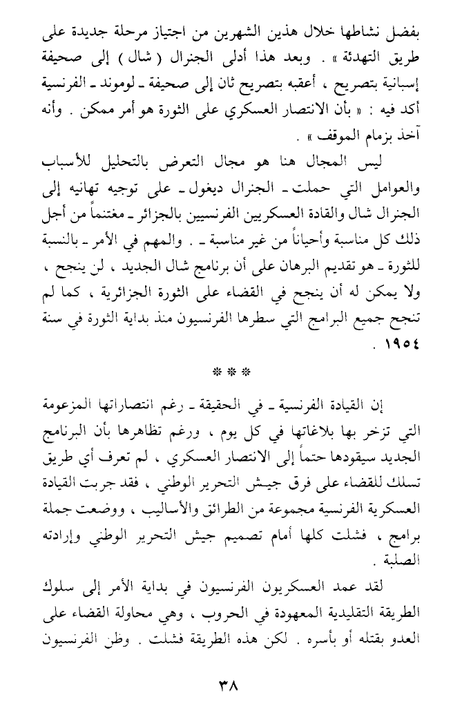 إن القيادة الفرنسية - في الحقيقة - رغم انتصاراتها المزعومة التي تزخر بها بلاغاتها في كل يوم، ورغم تظاهرها بأن البرنامج الجديد سيقودها حتما إلى الانتصار العسكري، لم تعرف أي طريق تسلك للقضاء على فرق جيش التحرير الوطني، فقد جربت القيادة العسكرية الفرنسية مجموعة من الطرائق والأساليب، ووضعت جملة برامج، فشلت كلها أمام تصميم جيش التحرير الوطني وإرادته الصلبة.