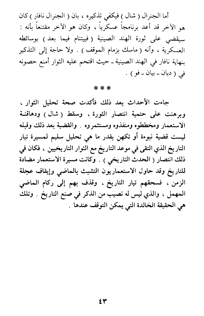 أما الجنرال (شال) فيكفي تذكيره، بأن (الجنرال نافار) كان هو الآخر قد أعد برنامجا عسكريا، وكان هو الآخر مقتنعا بأنه: سيقضي على ثورة الهند الصينية (فييتنام فيما بعد) بوسائطه العسكرية، وأنه (ماسك بزمام الموقف). ولا حاجة إلى التذكير بنهاية نافار في الهند الصينية - حيث اقتحم عليه الثوار أمنع حصونه في (ديان - بيان - فو).