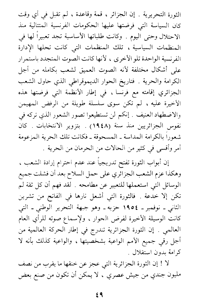 الثورة التحريرية. إن الجزائر، قمة وقاعدة، لم تقبل في أي وقت كان السياسة التي فرضتها عليها الحكومات الفرنسية المتتالية منذ الاحتلال وحتى اليوم. وكانت طلباتها الأساسية تجد تعبيرا لها في المنظمات السياسية، تلك المنظمات التي كانت تحلها الإدارة الفرنسية الواحدة تلو الأخرى، لأنها كانت الصوت المتجدد باستمرار على أشكال مختلفة لأنه الصوت العميق لشعب بكامله من أجل الكرامة والحرية. فتاريخ الحوار الديموقراطي الذي حاول الشعب الجزائري إقامته مع فرنسا، في إطار الأنظمة التي فرضتها هذه الأخيرة عليه، لم تكن سوى سلسلة طويلة من الرفض المهيمن والاضطهاد العنيف. إنكم لن تستطيعوا تصور الشعور الذي تركه في نفوس الجزائريين منذ سنة (1948). بتزوير الانتخابات كان شعورا بالكرامة المداسة المسحوقة - فكانت تلك الحرية المزعومة أمر وأقسى في كثير من الحالات من الحرمان من الحرية.