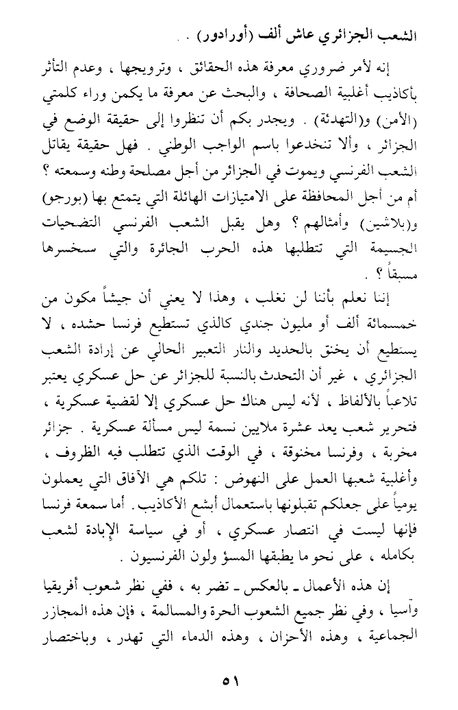 إننا نعلم بأننا لن نغلب، وهذا لا يعني أن جيشا مكون من خمسمائة ألف أو مليون جندي كالذي تستطيع فرنسا حشده، لا يستطيع أن يخنق بالحديد والنار التعبير الحالي عن إرادة الشعب الجزائري، غير أن التحدث بالنسبة للجزائر عن حل عسكري يعتبر تلاعبا بالألفاظ، لأنه ليس هناك حل عسكري إلا لقضية عسكرية، فتحرير شعب يعد عشرة ملايين نسمة ليس مسألة عسكرية. جزائر مخربة، وفرنسا مخنوقة، في الوقت الذي تتطلب فيه الظروف، وأغلبية شعبها العمل على النهوض: تلكم هي الآفاق التي يعملون يوميا على جعلكم تقبلونها باستعمال أبشع الأكاذيب. أما سمعة فرنسا فإنها ليست في انتصار عسكري، أو في سياسة الإبادة لشعب بكامله، على نحو ما يطبقها المسؤولون الفرنسيون.