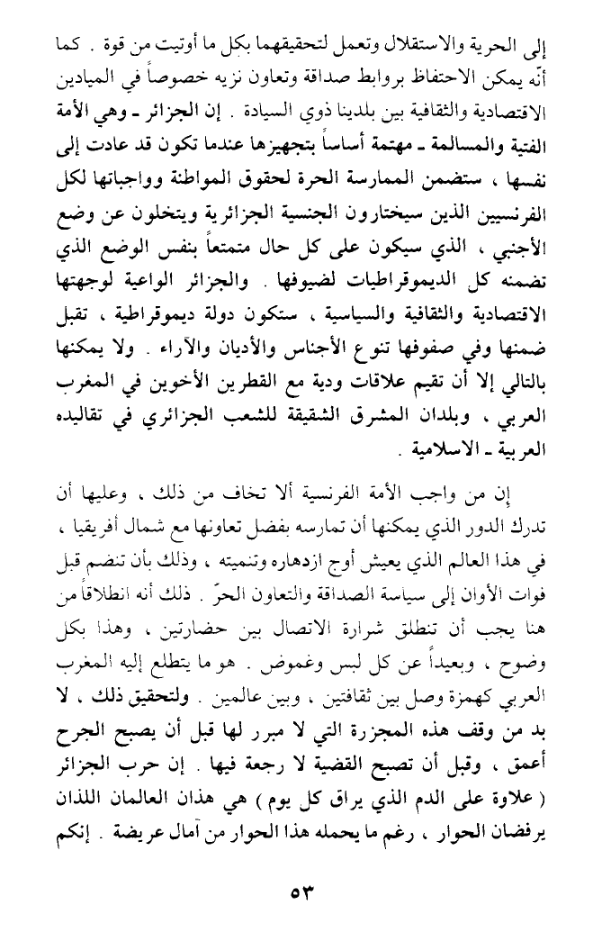 إن من واجب الأمة الفرنسية ألا تخاف من ذلك، وعليها أن تدرك الدور الذي يمكنها أن تمارسه بفضل تعاونها مع شمال أفريقيا، في هذا العالم الذي يعيش أوج ازدهاره وتنميته، وذلك بأن تنضم قبل فوات الأوان إلى سياسة الصداقة والتعاون الحر. ذلك أنه انطلاقا من هنا يجب أن تنطلق شرارة الاتصال بين حضارتين، وهذا بكل وضوح، وبعيدا عن كل لبس وغموض. هو ما يتطلع إليه المغرب العربي كهمزة وصل بين ثقافتين، وبين عالمين. ولتحقيق ذلك، لا بد من وقف هذه المجزرة التي لا مبرر لها قبل أن يصبح الجرح أعمق، وقبل أن تصبح القضية لا رجعة فيها. إن حرب الجزائر (علاوة على الدم الذي يراق كل يوم) هي هذان العالمان اللذان يرفضان الحوار، رغم ما يحمله هذا الحوار من آمال عريضة. إنكم