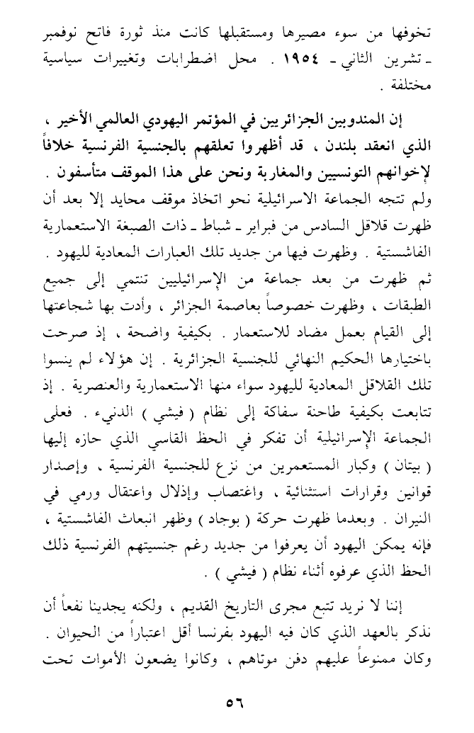 ولم تتجه الجماعة الاسرائيلية نحو اتخاذ موقف محايد إلا بعد أن ظهرت قلاقل السادس من فبراير - شباط - ذات الصبغة الاستعمارية الفاشستية. وظهرت فيها من جديد تلك العبارات المعادية لليهود ثم ظهرت من بعد جماعة من الإسرائيليين تنتمي إلى جميع الطبقات، وظهرت خصوصا بعاصمة الجزائر، وأدت بها شجاعتها إلى القيام بعمل مضاد للاستعمار. بكيفية واضحة، إذ صرحت باختيارها الحكيم النهائي للجنسية الجزائرية إن هؤلاء لم ينسوا تلك القلاقل المعادية لليهود سواء منها الاستعمارية والعنصرية. إذ تتابعت بكيفية طاحنة سفاكة إلى نظام (فيشي) الدنيء. فعلى الجماعة الإسرائيلية أن تفكر في الحظ القاسي الذي حازه إليها (بيتان) وكبار المستعمرين من نزع للجنسية الفرنسية، وإصدار قوانين وقرارات استثنائية، واغتصاب وإذلال واعتقال ورمي في النيران. وبعدما ظهرت حركة (بوجاد) وظهر انبعاث الفاشستية، فإنه يمكن اليهود أن يعرفوا من جديد رغم جنسيتهم الفرنسية ذلك الحظ الذي عرفوه أثناء نظام (فيشي).