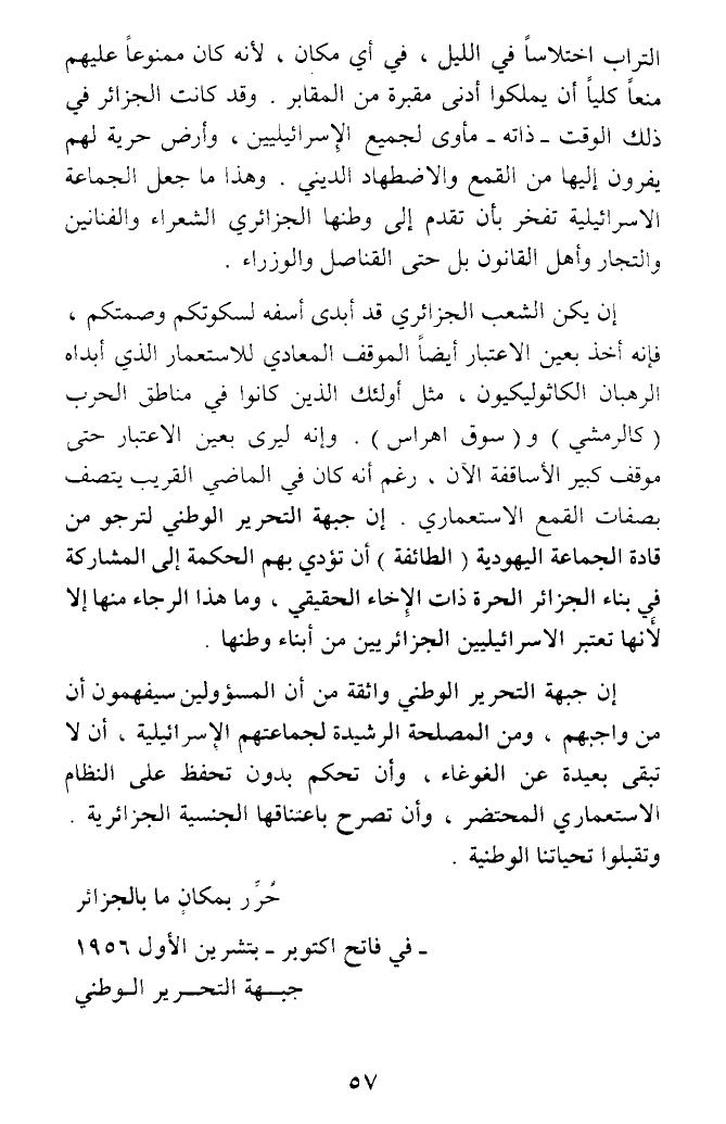 إن جبهة التحرير الوطني واثقة من أن المسؤولين سيفهمون أن من واجبهم، ومن المصلحة الرشيدة لجماعتهم الإسرائيلية، أن لا تبقى بعيدة عن الغوغاء، وأن تحكم بدون تحفظ على النظام الاستعماري المحتضر، وأن تصرح باعتناقها الجنسية الجزائرية. وتقبلوا تحياتنا الوطنية.
