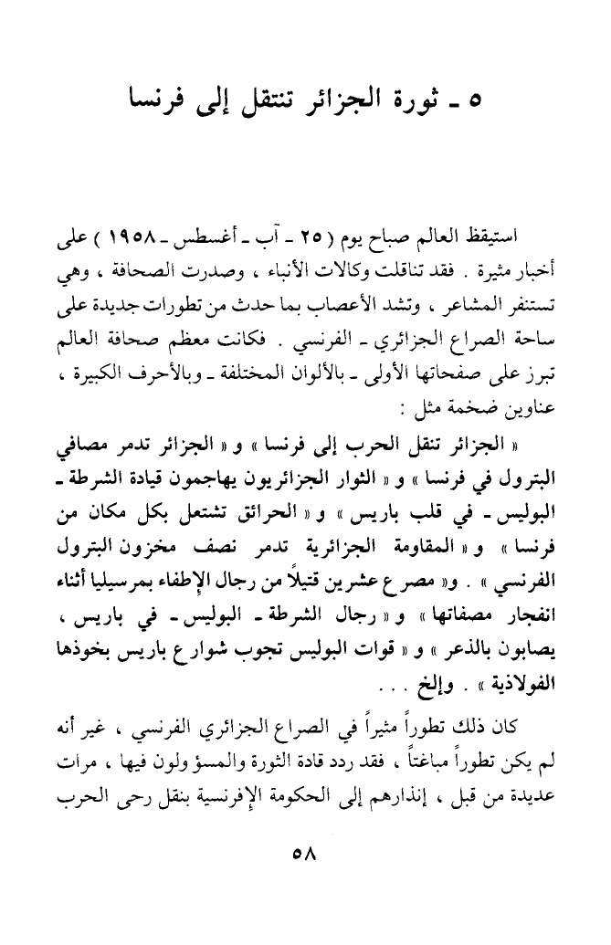 البوليس - في قلب باريس) و (الحرائق تشتعل بكل مكان من فرنسا) و (المقاومة الجزائرية تدمر نصف مخزون البترول الفرنسي) و (مصرع عشرين قتيلا من رجال الإطفاء بمرسيليا أثناء انفجار مصفاتها) و (رجال الشرطة - البوليس - في باريس، يصابون بالذعر) و (قوات البوليس تجوب شوارع باريس بخوذها الفولاذية). وإلخ ...