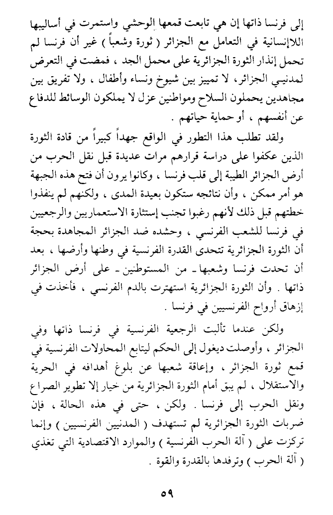 ولكن عندما تألبت الرجعية الفرنسية في فرنسا ذاتها وفي الجزائر، وأوصلت ديغول إلى الحكم ليتابع المحاولات الفرنسية في قمع ثورة الجزائر، وإعاقة شعبها عن بلوغ أهدافه في الحرية والاستقلال، لم يبق أمام الثورة الجزائرية من خيار إلا تطوير الصراع ونقل الحرب إلى فرنسا. ولكن، حتى في هذه الحالة، فإن ضربات الثورة الجزائرية لم تستهدف (المدنيين الفرنسيين) وإنما تركزت على (آلة الحرب الفرنسية) والموارد الاقتصادية التي تغذي (آلة الحرب) وترفدها بالقدرة والقوة.