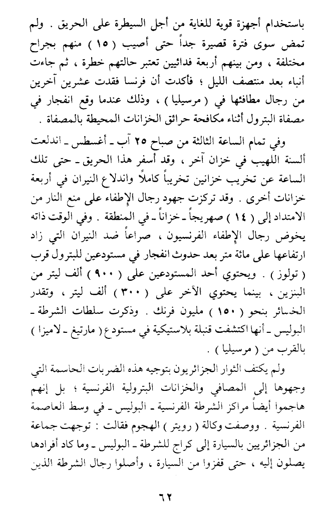 باستخدام أجهزة قوية للغاية من أجل السيطرة على الحريق. ولم تمض سوى فترة قصيرة جدا حتى أصيب (15) منهم بجراح مختلفة، ومن بينهم أربعة فدائيين تعتبر حالتهم خطرة، ثم جاءت أنباء بعد منتصف الليل؛ فأكدت أن فرنسا فقدت عشرين آخرين من رجال مطافئها في (مرسيليا)، وذلك عندما وقع انفجار في مصفاة البترول أثناء مكافحة حرائق الخزانات المحيطة بالمصفاة.
