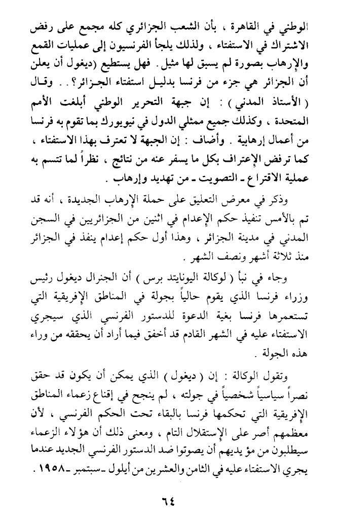 الوطني في القاهرة، بأن الشعب الجزائري كله مجمع على رفض الاشتراك في الاستفتاء، ولذلك يلجأ الفرنسيون إلى عمليات القمع والإرهاب بصورة لم يسبق لها مثيل. فهل يستطيع (ديغول أن يعلن أن الجزائر هي جزء من فرنسا بدليل استغتاء الجزائر؟ .. وقال (الأستاذ المدني): إن جبهة التحرير الوطني أبلغت الأمم المتحدة، وكذلك جميع ممثلي الدول في نيويورك بما تقوم به فرنسا من أعمال إرهابية. وأضاف: إن الجبهة لا تعترف بهذا الاستفتاء، كما ترفض الاعتراف بكل ما يسفر عنه من نتائج، نظرا لما تتسم به عملية الاقتراع - التصويت - من تهديد وإرهاب.