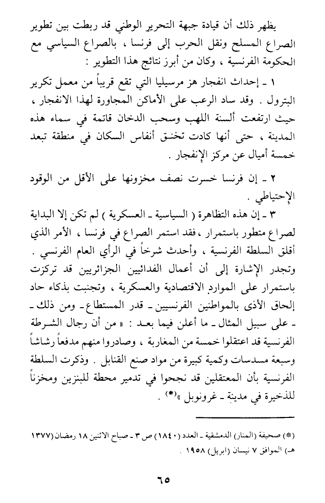 3 - إن هذه التظاهرة (السياسية - العسكرية) لم تكن إلا البداية لصراع متطور باستمرار، فقد استمر الصراع في فرنسا، الأمر الذي أقلق السلطة الفرنسية، وأحدث شرخا في الرأي العام الفرنسي. وتجدر الإشارة إلى أن أعمال الفدائيين الجزائريين قد تركزت باستمرار على الموارد الاقتصادية والعسكرية، وتجنبت بذكاء حاد إلحاق الأذى بالمواطنين الفرنسيين - قدر المستطاع - ومن ذلك - - على سبيل المثال - ما أعلن فيما بعد: (من أن رجال الشرطة الفرنسية قد اعتقلوا خمسة من المغاربة، وصادروا منهم مدفعا رشاشا وسبعة مسدسات وكمية كبيرة من مواد صنع القنابل وذكرت السلطة الفرنسية بأن المعتقلين قد نجحوا في تدمير محطة للبنزين ومخزنا للذخيرة في مدينة - غرونوبل) (*).