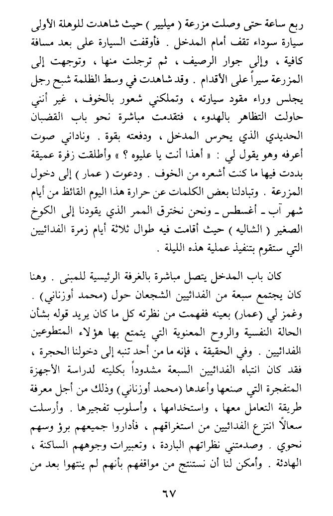 ربع ساعة حتى وصلت مزرعة (ميليير) حيث شاهدت للوهلة الأولى سيارة سوداء تقف أمام المدخل. فأوقفت السيارة على بعد مسافة كافية، وإلى جوار الرصيف، ثم ترجلت منها، وتوجهت إلى المزرعة سيرا على الأقدام. وقد شاهدت في وسط الظلمة شبح رجل يجلس وراء مقود سيارته، وتملكني شعور بالخوف، غير أنني حاولت التظاهر بالهدوء، فتقدمت مباشرة نحو باب القضبان الحديدي الذي يحرس المدخل، ودفعته بقوة. وناداني صوت أعرفه وهو يقول لي (أهذا أنت يا عليوه؟) وأطلقت زفرة عميقة بددت فيها ما كنت أشعره من الخوف. ودعوت (عمار) إلى دخول المزرعة. وتبادلنا بعض الكلمات عن حرارة هذا اليوم القائظ من أيام شهر آب - أغسطس - ونحن نخترق الممر الذي يقودنا إلى الكوخ الصغير (الشاليه) حيث أقامت فيه طوال ثلاثة أيام زمرة الفدائيين التي ستقوم بتنفيذ عملية هذه الليلة.