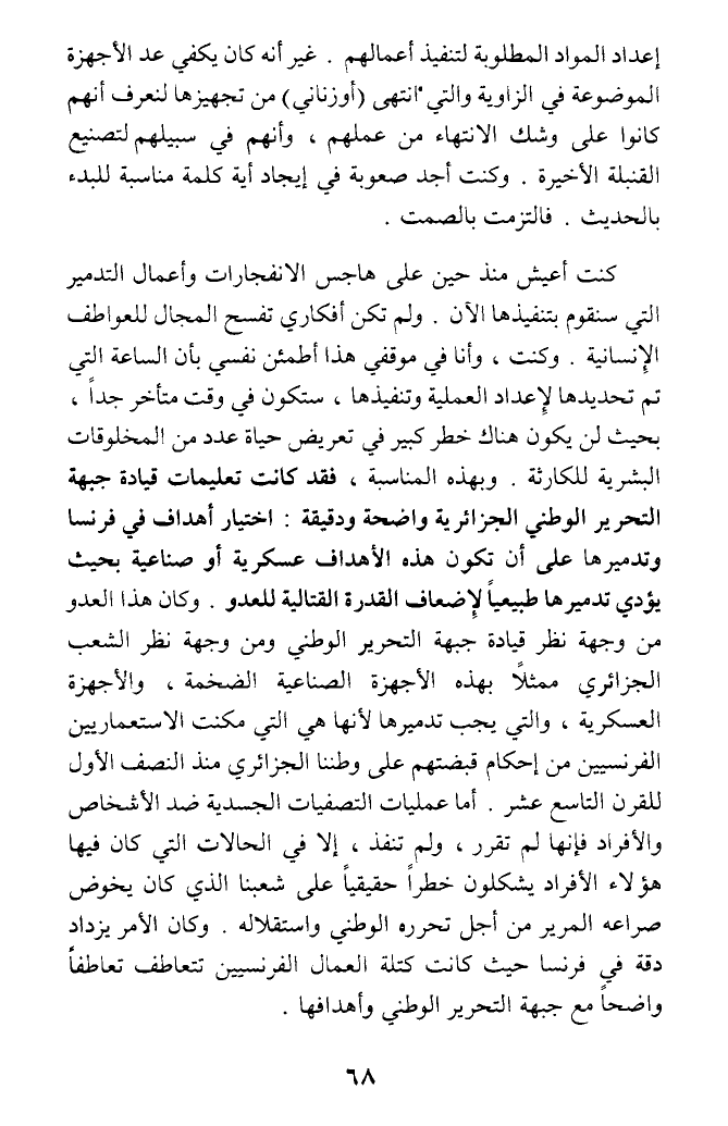 كنت أعيش منذ حين على هاجس الانفجارات وأعمال التدمير التي سنقوم بتنفيذها الآن. ولم تكن أفكاري تفسح المجال للعواطف الإنسانية. وكنت، وأنا في موقفي هذا أطمئن نفسي بأن الساعة التي تم تحديدها لإعداد العملية وتنفيذها، ستكون في وقت متأخر جدا، بحيث لن يكون هناك خطر كبير في تعريض حياة عدد من المخلوقات البشرية للكارثة وبهذه المناسبة، فقد كانت تعليمات قيادة جبهة التحرير الوطني الجزائرية واضحة ودقيقة: اختيار أهداف في فرنسا وتدميرها على أن تكون هذه الأهداف عسكرية أو صناعية بحيث يؤدي تدميرها طبيعيا لإضعاف القدرة القتالية للعدو. وكان هذا العدو من وجهة نظر قيادة جبهة التحرير الوطني ومن وجهة نظر الشعب الجزائري ممثلا بهذه الأجهزة الصناعية الضخمة، والأجهزة العسكرية، والتي يجب تدميرها لأنها هي التي مكنت الاستعماريين الفرنسيين من إحكام قبضتهم على وطننا الجزائري منذ النصف الأول للقرن التاسع عشر. أما عمليات التصفيات الجسدية ضد الأشخاص والأفراد فإنها لم تقرر، ولم تنفذ، إلا في الحالات التي كان فيها هؤلاء الأفراد يشكلون خطرا حقيقيا على شعبنا الذي كان يخوض صراعه المرير من أجل تحرره الوطني واستقلاله. وكان الأمر يزداد دقة في فرنسا حيث كانت كتلة العمال الفرنسيين تتعاطف تعاطفا واضحا مع جبهة التحرير الوطني وأهدافها.
