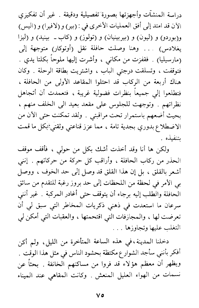 دراسة المنشآت وأجهزتها بصورة تفصيلية ودقيقة. غير أن تفكيري الآن قد امتد إلى أفق العمليات الأخرى في: (بير) و (لافيرا) و (اليس) و (بوردو) و (ليون) و (بيربينيان) و (تولوز) و (كاب - بينيد) و (ليزا يغلادس) ... وهنا وصلت حافلة نقل (أوتوكار) متوجهة إلى (مارسيليا). فقفزت من مكاني، وأشرت إليها ملوحا بكلتا يدي. فتوقفت، وتسلقت درجتي الباب، واشتريت بطاقة الرحلة. وكان هناك أربعة من الركاب قد احتلوا المقاعد الأولى من الحافلة، فتطلعوا إلي جميعا بنظرات فضولية، غريبة، فتعمدت أن أتجاهل نظراتهم. وتوجهت للجلوس على مقعد بعيد الى الخلف منهم، بحيث أضعهم باستمرار تحت مراقبتي. ولقد تمكنت حتى الآن من الاضطلاع بدوري بجدية تامة، مما عزز قناعتي وثقتي: بكل ما قمت بتنفيذه.