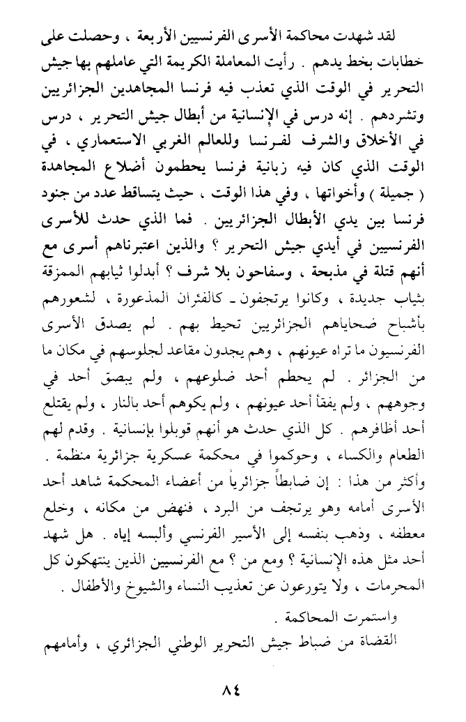لقد شهدت محاكمة الأسرى الفرنسيين الأربعة، وحصلت على خطابات بخط يدهم. رأيت المعاملة الكريمة التي عاملهم بها جيش التحرير في الوقت الذي تعذب فيه فرنسا المجاهدين الجزائريين وتشردهم. إنه درس في الإنسانية من أبطال جيش التحرير، درس في الأخلاق والشرف لفرنسا وللعالم الغربي الاستعماري، في الوقت الذي كان فيه زبانية فرنسا يحطمون أضلاع المجاهدة (جميلة) وأخواتها، وفي هذا الوقت، حيث يتساقط عدد من جنود فرنسا بين يدي الأبطال الجزائريين. فما الذي حدث للأسرى الفرنسيين في أيدي جيش التحرير؟ والذين اعتبرناهم أسرى مع أنهم قتلة في مذبحة، وسفاحون بلا شرف؟ أبدلوا ثيابهم الممزقة بثياب جديدة، وكانوا يرتجفون - كالفئران المذعورة، لشعورهم بأشباح ضحاياهم الجزائريين تحيط بهم. لم يصدق الأسرى الفرنسيون ما تراه عيونهم، وهم يجدون مقاعد لجلوسهم في مكان ما من الجزائر. لم يحطم أحد ضلوعهم، ولم يبصق أحد في وجوههم، ولم يفقأ أحد عيونهم، ولم يكوهم أحد بالنار، ولم يقتلع أحد أظافرهم. كل الذي حدث هو أنهم قوبلوا بإنسانية. وقدم لهم