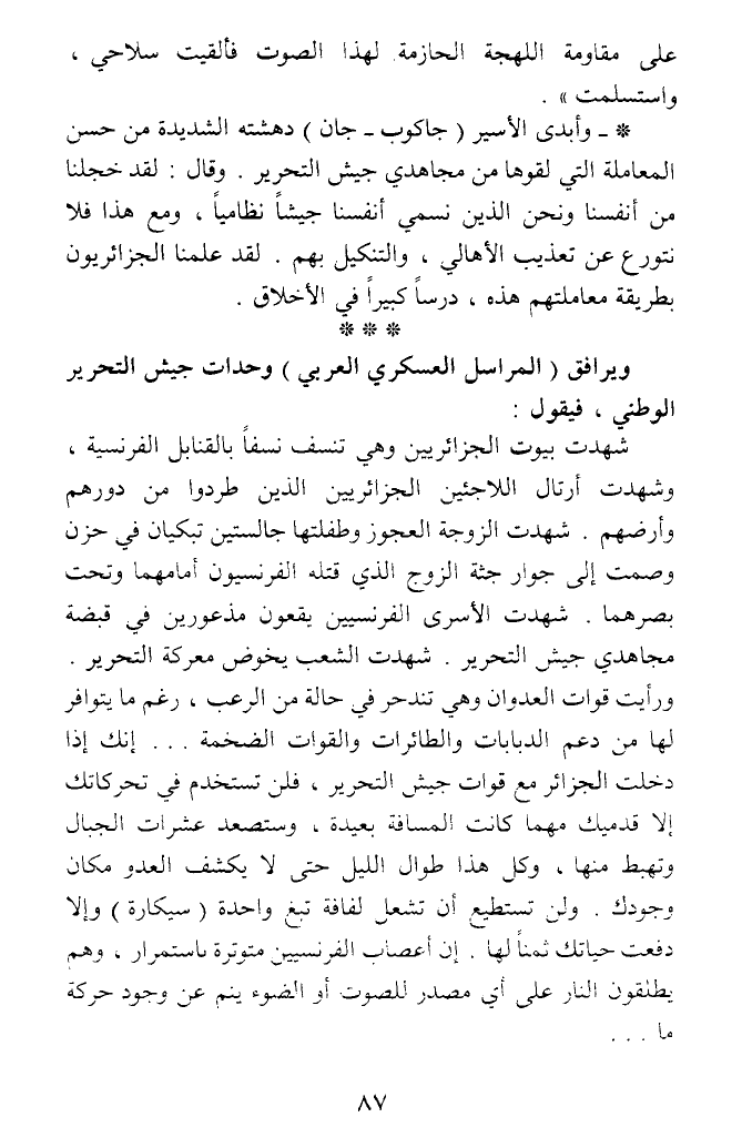 * - وأبدى الأسير (جاكوب - جان) دهشته الشديدة من حسن المعاملة التي لقوها من مجاهدي جيش التحرير. وقال لقد خجلنا من أنفسنا ونحن الذين نسمي أنفسنا جيشا نظاميا، ومع هذا فلا نتورع عن تعذيب الأهالي، والتنكيل بهم. لقد علمنا الجزائريون بطريقة معاملتهم هذه، درسا كبيرا في الأخلاق.