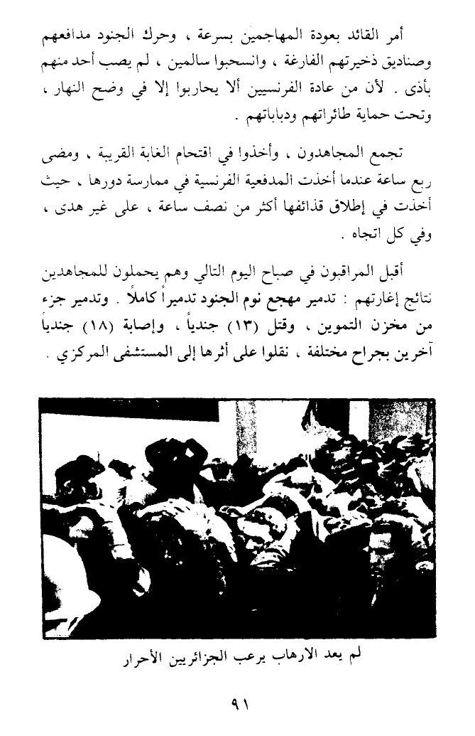 أمر القائد بعودة المهاجمين بسرعة، وحرك الجنود مدافعهم وصناديق ذخيرتهم الفارغة، وانسحبوا سالمين، لم يصب أحد منهم بأذى. لأن من عادة الفرنسيين ألا يحاربوا إلا في وضح النهار، وتحت حماية طائراتهم ودباباتهم.