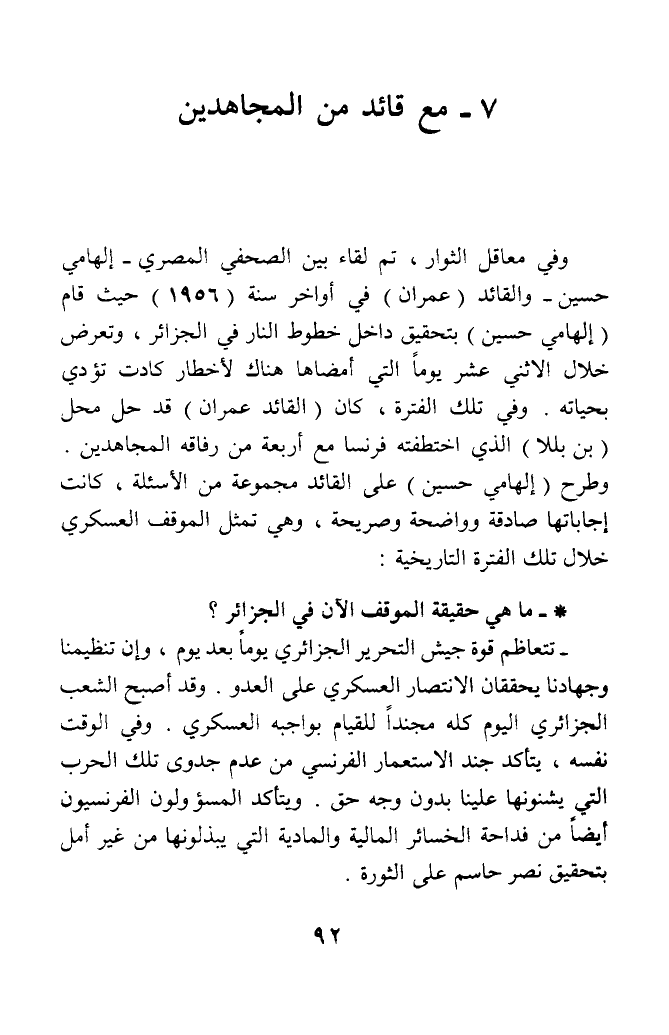 وفي معاقل الثوار، تم لقاء بين الصحفي المصري - إلهامي حسين - والقائد (عمران) في أواخر سنة (1956) حيث قام (إلهامي حسين) بتحقيق داخل خطوط النار في الجزائر، وتعرض خلال الاثني عشر يوما التي أمضاها هناك لأخطار كادت تؤدي بحياته. وفي تلك الفترة، كان (القائد عمران) قد حل محل (بن بللا) الذي اختطفته فرنسا مع أربعة من رفاقه المجاهدين. وطرح (إلهامي حسين) على القائد مجموعة من الأسئلة، كانت إجاباتها صادقة وواضحة وصريحة، وهي تمثل الموقف العسكري خلال تلك الفترة التاريخية: