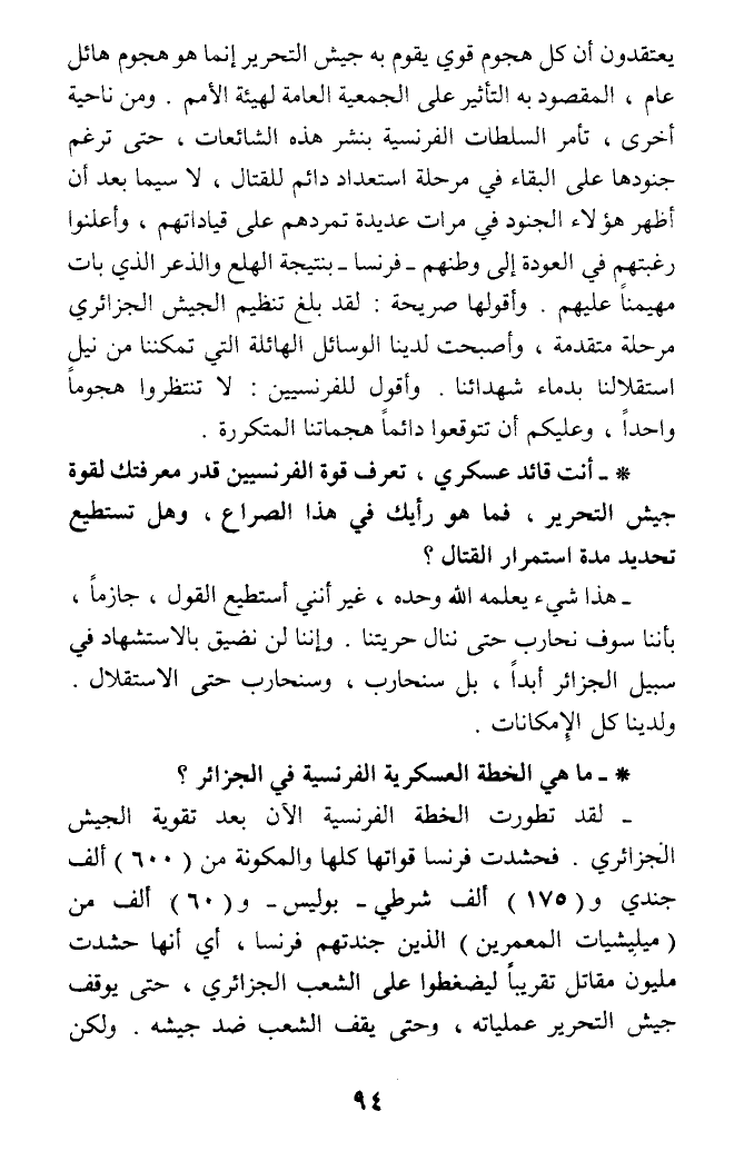 * - أنت قائد عسكري، تعرف قوة الفرنسيين قدر معرفتك لقوة جيش التحرير، فما هو رأيك في هذا الصراع، وهل تستطيع تحديد مدة استمرار القتال؟