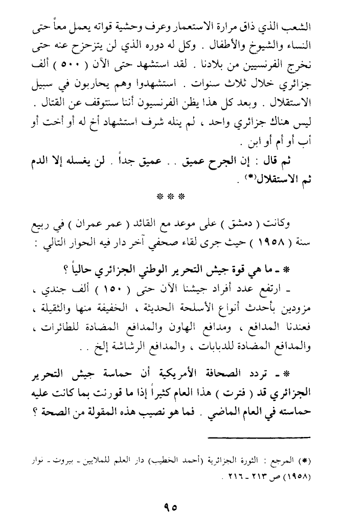 (*) المرجع: الثورة الجزائرية (أحمد الخطيب) دار العلم للملايين - بيروت - نوار (1958) ص 213 - 216.