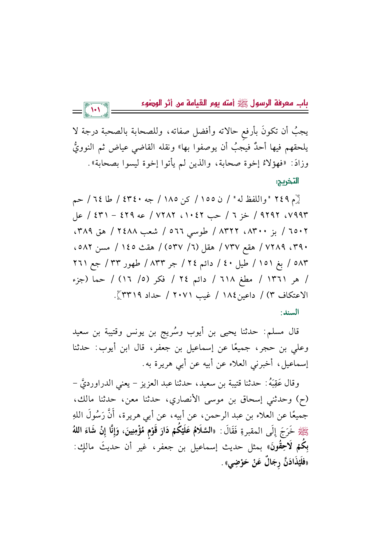 يجبُ أن تكونَ بأرفعِ حالاته وأفضل صفاته، وللصحابة بالصحبة درجة لا يلحقهم فيها أحدٌ فيجبُ أن يوصفوا بها" ونقله القاضي عياض ثم النوويُّ وزادَ: "فهؤلاءُ إخوة صحابة، والذين لم يأتوا إخوة ليسوا بصحابة".