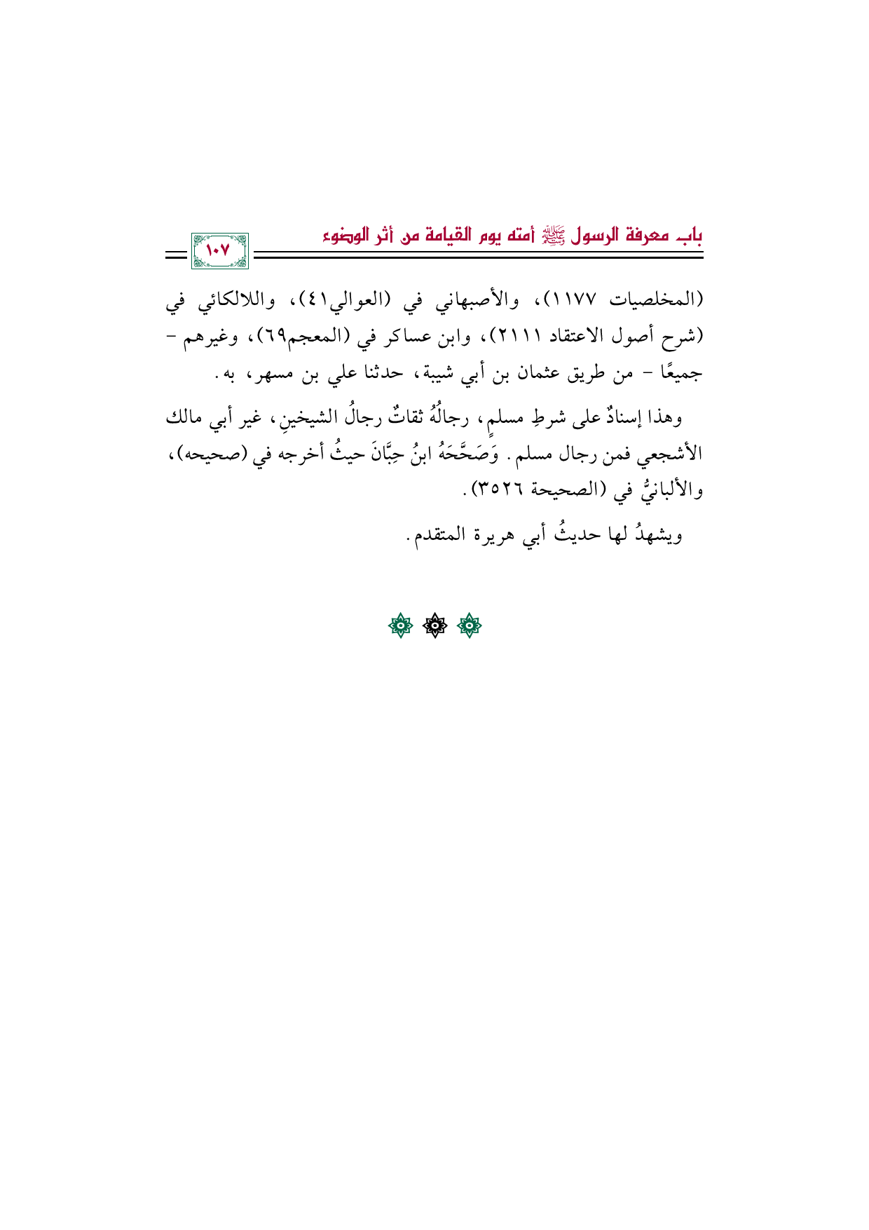 وهذا إسنادٌ على شرطِ مسلمٍ، رجالُهُ ثقاتٌ رجالُ الشيخينِ، غير أبي مالك الأشجعي فمن رجال مسلم. وَصَحَّحَهُ ابنُ حِبَّانَ حيثُ أخرجه في (صحيحه)، والألبانيُّ في (الصحيحة ٣٥٢٦).