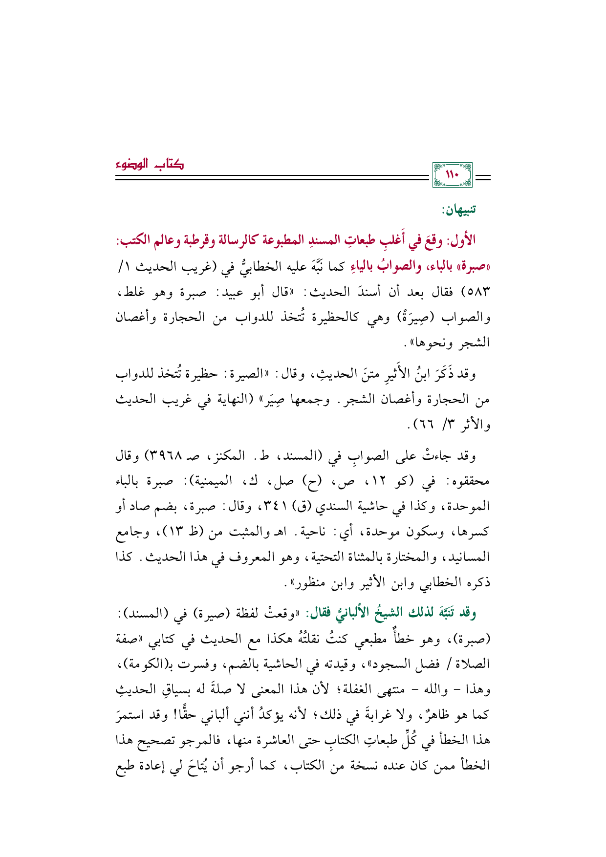 وقد تَنَبَّهَ لذلك الشيخُ الألبانيُّ فقال: "وقعتْ لفظة (صيرة) في (المسند): (صبرة)، وهو خطأٌ مطبعي كنتُ نقلتُهُ هكذا مع الحديث في كتابي "صفة الصلاة/ فضل السجود"، وقيدته في الحاشية بالضم، وفسرت بـ (الكومة)، وهذا -والله- منتهى الغفلة؛ لأن هذا المعنى لا صلةَ له بسياقِ الحديثِ كما هو ظاهرٌ، ولا غرابةَ في ذلك؛ لأنه يؤكدُ أنني ألباني حقًّا! وقد استمرَ هذا الخطأ في كُلِّ طبعاتِ الكتابِ حتى العاشرة منها، فالمرجو تصحيح هذا الخطأ ممن كان عنده نسخة من الكتاب، كما أرجو أن يُتاحَ لي إعادة طبع