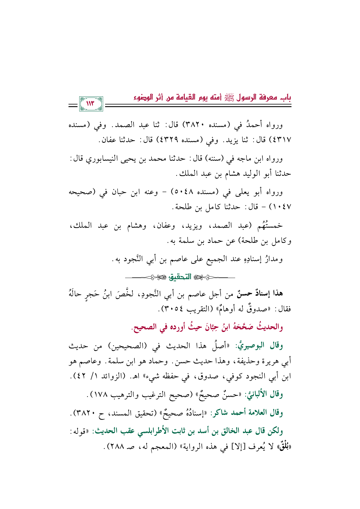 وقال البوصيريُّ: "أصلُ هذا الحديث في (الصحيحين) من حديث أبي هريرة وحذيفة، وهذا حديث حسن. وحماد هو ابن سلمة. وعاصم هو ابن أبي النجود كوفي، صدوق، في حفظه شيء" اهـ. (الزوائد ١/ ٤٢).