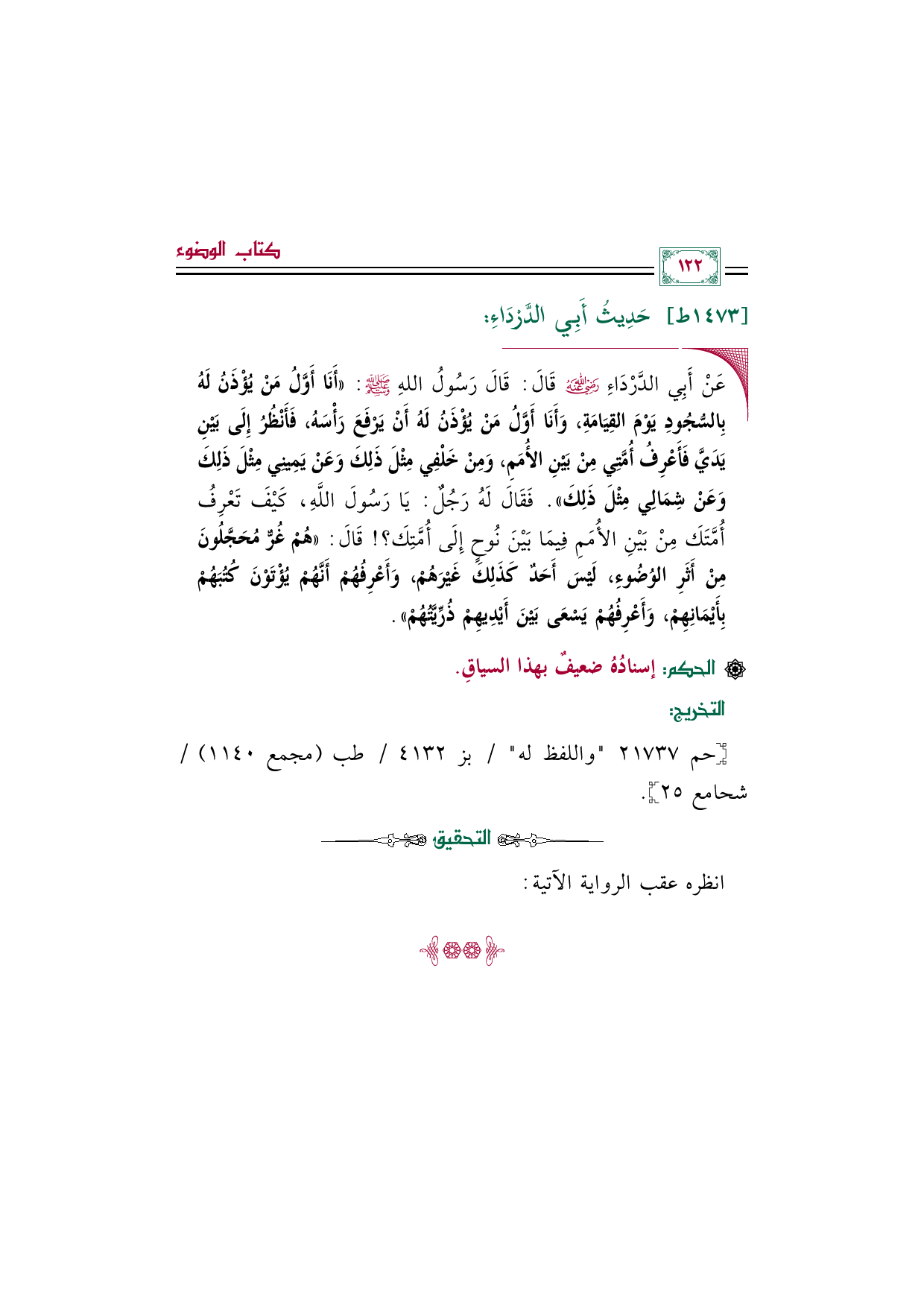 ◼عَنْ أَبِي الدَّرْدَاءِ رضي الله عنه قَالَ: قَالَ رَسُولُ اللهِ صلى الله عليه وسلم: «أَنَا أَوَّلُ مَنْ يُؤْذَنُ لَهُ بِالسُّجُودِ يَوْمَ القِيَامَةِ، وَأَنَا أَوَّلُ مَنْ يُؤْذَنُ لَهُ أَنْ يَرْفَعَ رَأْسَهُ، فَأَنْظُرُ إِلَى بَيْنِ يَدَيَّ فَأَعْرِفُ أُمَّتِي مِنْ بَيْنِ الأُمَمِ، وَمِنْ خَلْفِي مِثْلَ ذَلِكَ وَعَنْ يَمِينِي مِثْلَ ذَلِكَ وَعَنْ شِمَالِي مِثْلَ ذَلِكَ». فَقَالَ لَهُ رَجُلٌ: يَا رَسُولَ اللَّهِ، كَيْفَ تَعْرِفُ أُمَّتَكَ مِنْ بَيْنِ الأُمَمِ فِيمَا بَيْنَ نُوحٍ إِلَى أُمَّتِكَ؟ ! قَالَ: «هُمْ غُرٌّ مُحَجَّلُونَ مِنْ أَثَرِ الوُضُوءِ، لَيْسَ أَحَدٌ كَذَلِكَ غَيْرَهُمْ، وَأَعْرِفُهُمْ أَنَّهُمْ يُؤْتَوْنَ كُتُبَهُمْ بِأَيْمَانِهِمْ، وَأَعْرِفُهُمْ يَسْعَى بَيْنَ أَيْدِيهِمْ ذُرِّيَّتُهُمْ».