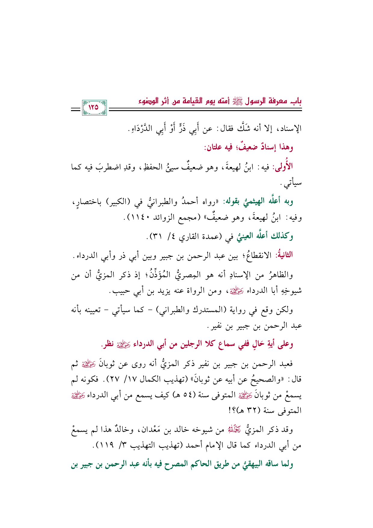 فعبد الرحمن بن جبير بن نفير ذكر المزيُّ أنه روى عن ثوبانَ رضي الله عنه ثم قال: "والصحيحُ عن أبيه عن ثوبانَ" (تهذيب الكمال ١٧/ ٢٧). فكونه لم يسمعْ من ثوبانَ رضي الله عنه المتوفى سنة (٥٤ هـ) كيف يسمع من أبي الدرداء رضي الله عنه المتوفى سنة (٣٢ هـ)؟ !