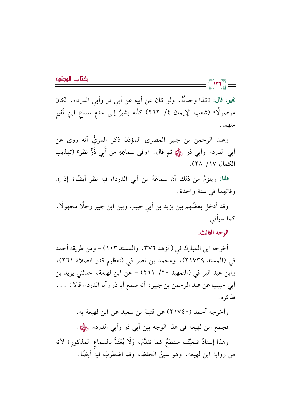 نفير، قال: " كذا وجدتُهُ، ولو كان عن أبيه عن أبي ذر وأبي الدرداء، لكان موصولًا" (شعب الإيمان ٤/ ٢٦٢) كأنه يشيرُ إلى عدمِ سماعِ ابنِ نُفيرٍ منهما.