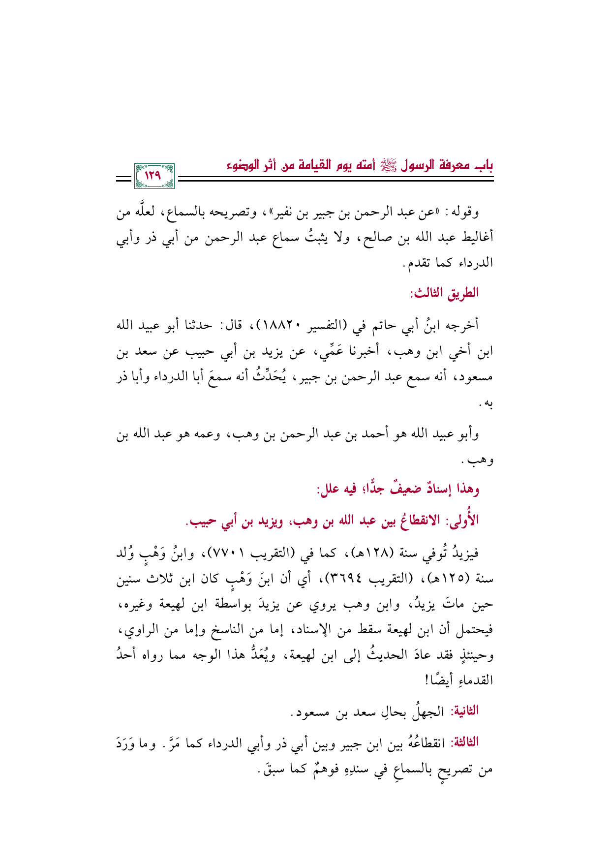 وقوله: "عن عبد الرحمن بن جبير بن نفير"، وتصريحه بالسماع، لعلَّه من أغاليط عبد الله بن صالح، ولا يثبتُ سماع عبد الرحمن من أبي ذر وأبي الدرداء كما تقدم.