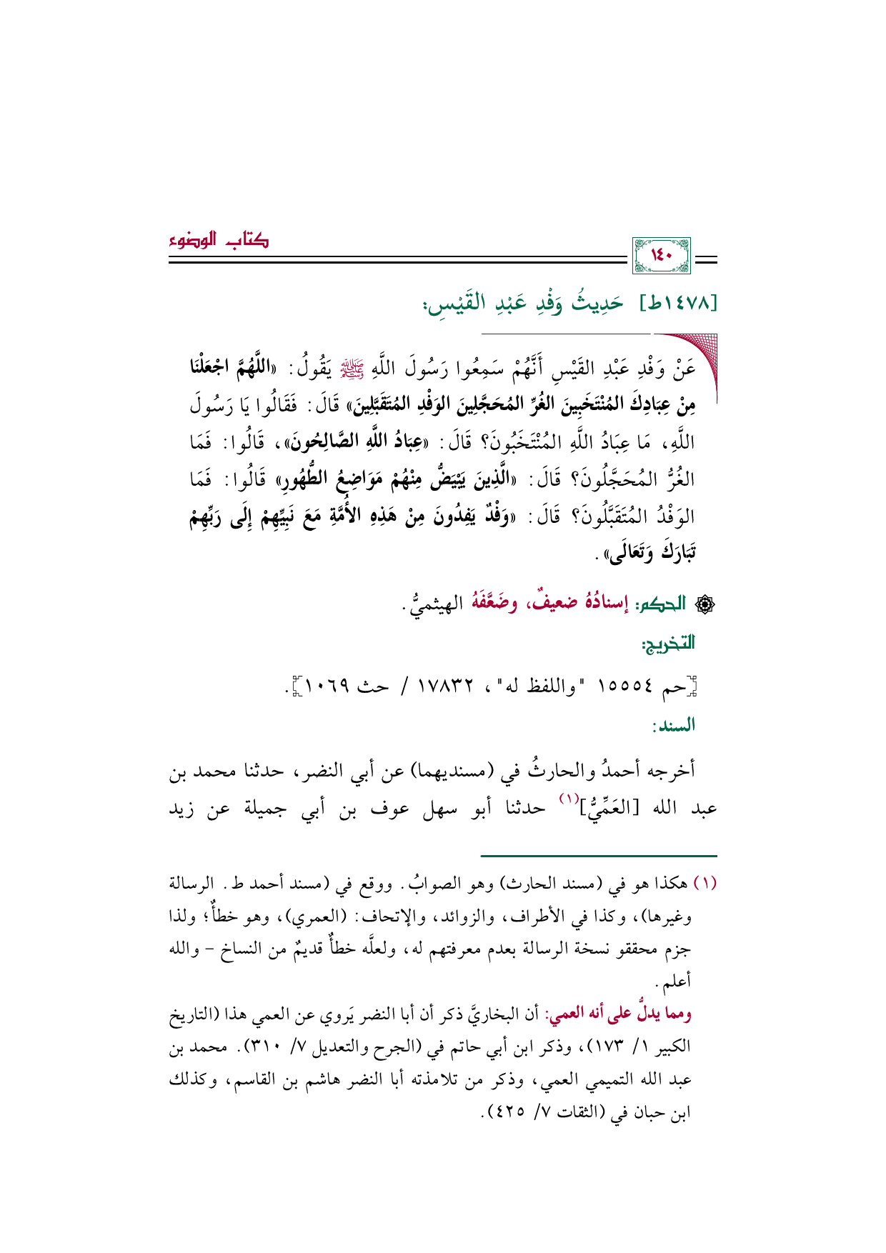 أخرجه أحمدُ والحارثُ في (مسنديهما) عن أبي النضر، حدثنا محمد بن عبد الله [العَمِّيُّ] (¬١) حدثنا أبو سهل عوف بن أبي جميلة عن زيد