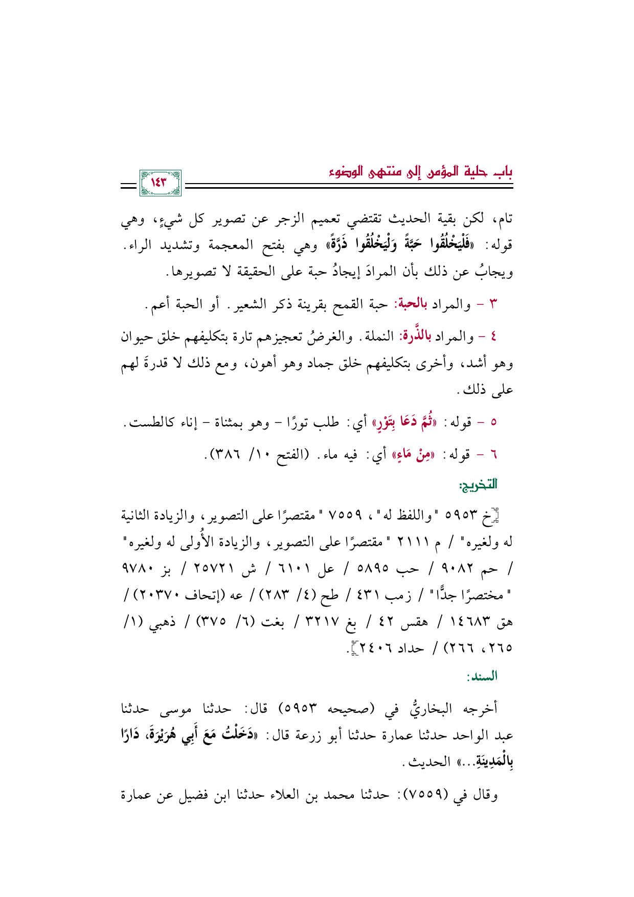 تام، لكن بقية الحديث تقتضي تعميم الزجر عن تصوير كل شيءٍ، وهي قوله: «فَلْيَخْلُقُوا حَبَّةً وَلْيَخْلُقُوا ذَرَّةً» وهي بفتح المعجمة وتشديد الراء. ويجابُ عن ذلك بأن المرادَ إيجادُ حبة على الحقيقة لا تصويرها.