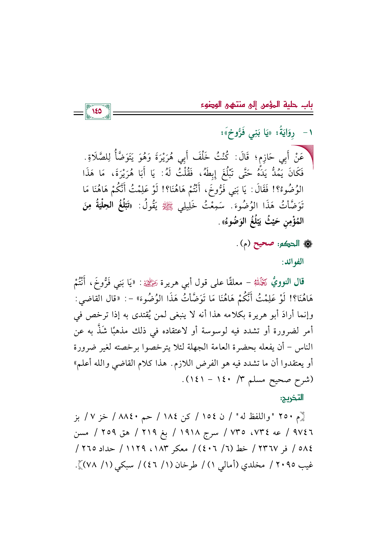 قال النوويُّ رحمه الله -معلقًا على قول أبي هريرة رضي الله عنه: ((يَا بَنِي فَرُّوخَ، أَنْتُمْ هَاهُنَا؟! لَوْ عَلِمْتُ أَنَّكُمْ هَاهُنَا مَا تَوَضَّأتُ هَذَا الوُضُوءَ)) -: ((قال القاضي: وإنما أرادَ أبو هريرة بكلامه هذا أنه لا ينبغى لمن يُقتدى به إذا ترخص في أمر لضرورة أو تشدد فيه لوسوسة أو لاعتقاده في ذلك مذهبًا شَذَّ به عن الناس- أن يفعله بحضرة العامة الجهلة لئلا يترخصوا برخصته لغير ضرورة أو يعتقدوا أن ما تشدد فيه هو الفرض اللازم. هذا كلام القاضي والله أعلم)) (شرح صحيح مسلم ٣/ ١٤٠ - ١٤١).