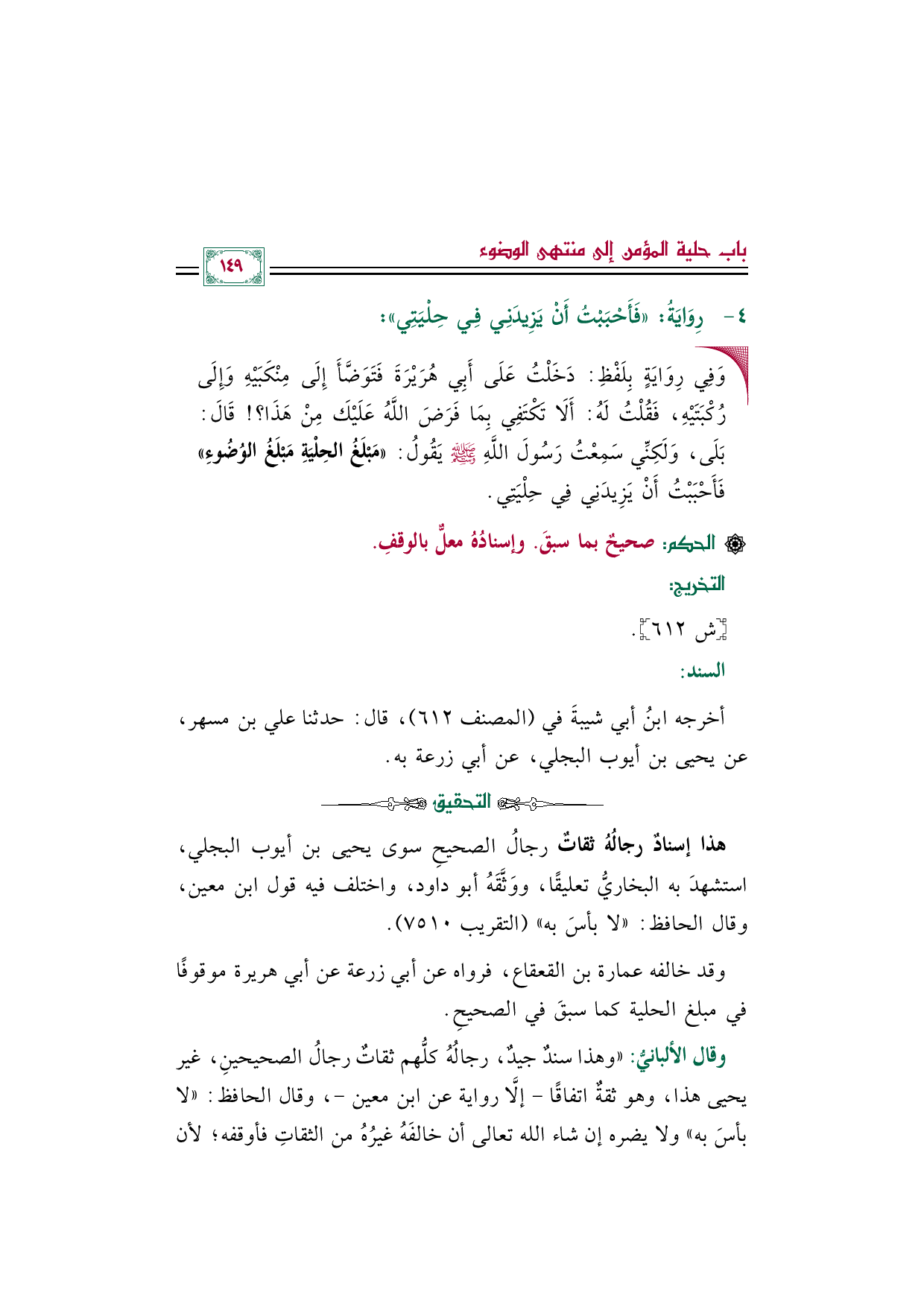 وقال الألبانيُّ: ((وهذا سندٌ جيدٌ، رجالُهُ كلُّهم ثقاتٌ رجالُ الصحيحينِ، غير يحيى هذا، وهو ثقةٌ اتفاقًا -إلَّا رواية عن ابن معين-، وقال الحافظ: "لا بأسَ به" ولا يضره إن شاء الله تعالى أن خالفَهُ غيرُهُ من الثقاتِ فأوقفه؛ لأن