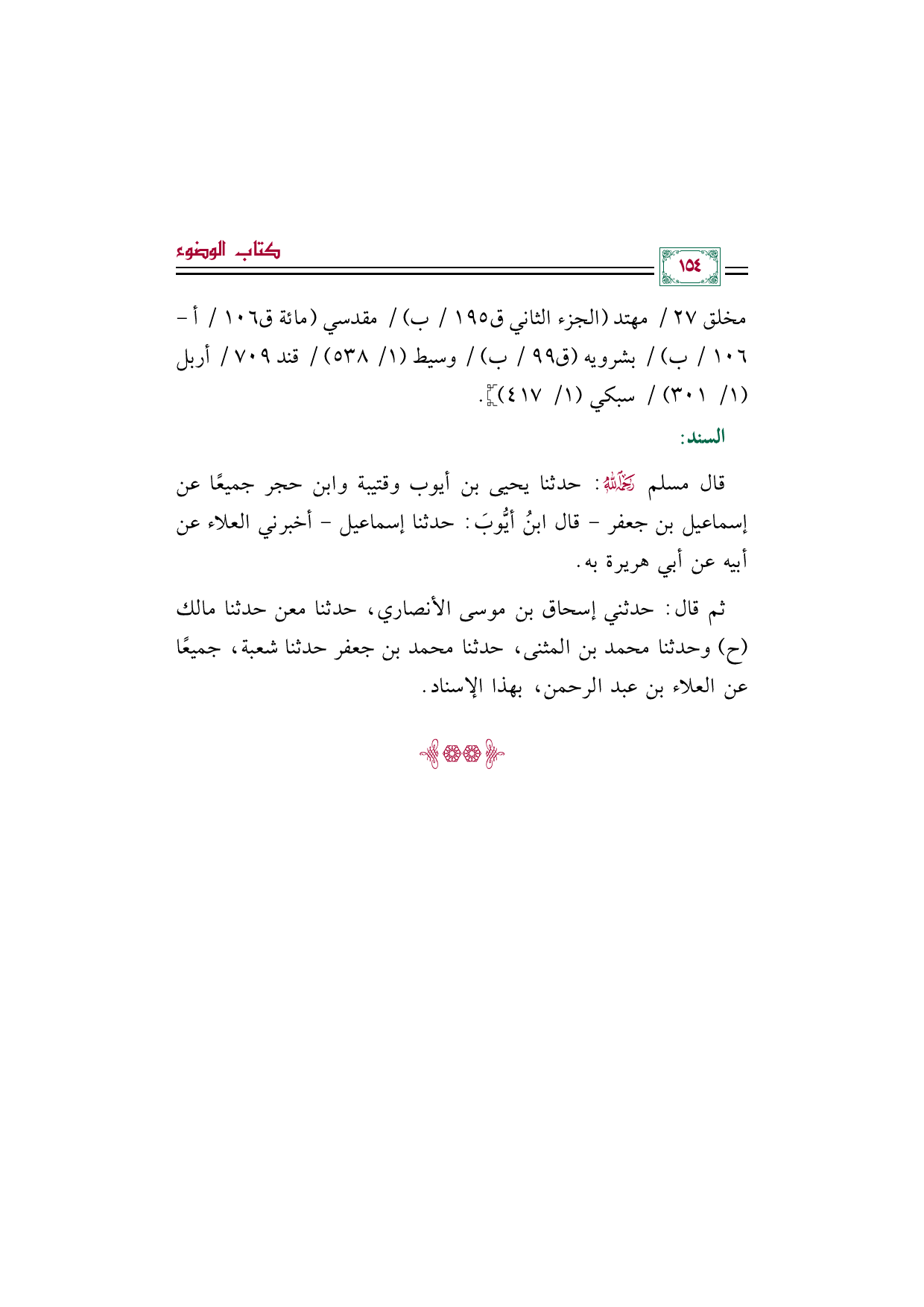 قال مسلم رحمه الله: حدثنا يحيى بن أيوب وقتيبة وابن حجر جميعًا عن إسماعيل بن جعفر -قال ابنُ أيُّوبَ: حدثنا إسماعيل- أخبرني العلاء عن أبيه عن أبي هريرة به.