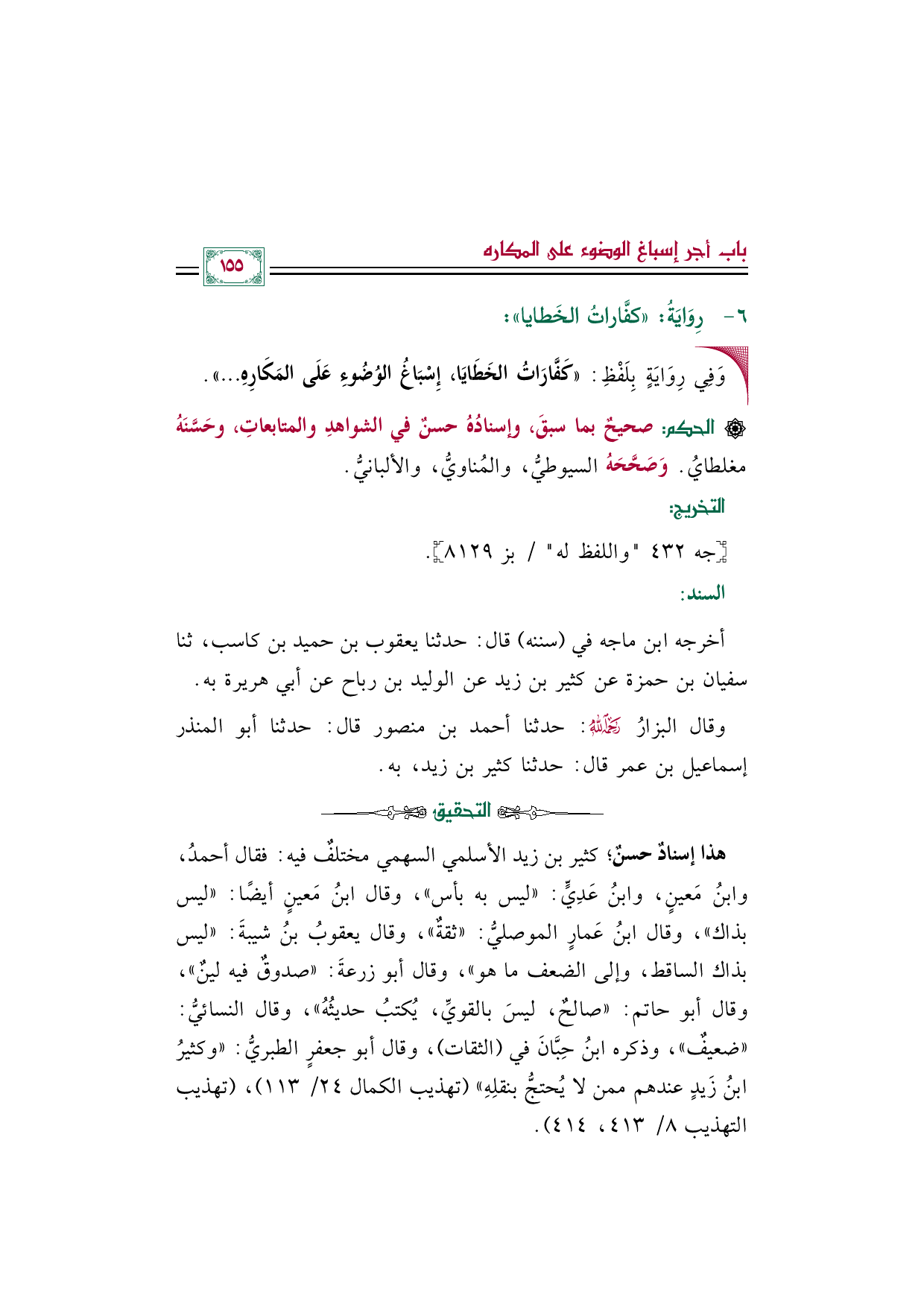 هذا إسنادٌ حسنٌ؛ كثير بن زيد الأسلمي السهمي مختلفٌ فيه: فقال أحمدُ، وابنُ مَعينٍ، وابنُ عَدِيٍّ: "ليس به بأس"، وقال ابنُ مَعينٍ أيضًا: "ليس بذاك"، وقال ابنُ عَمارٍ الموصليُّ: "ثقةٌ"، وقال يعقوبُ بنُ شيبةَ: "ليس بذاك الساقط، وإلى الضعف ما هو"، وقال أبو زرعةَ: "صدوقٌ فيه لينٌ"، وقال أبو حاتم: "صالحٌ، ليسَ بالقويِّ، يُكتبُ حديثُهُ"، وقال النسائيُّ: "ضعيفٌ"، وذكره ابنُ حِبَّانَ في (الثقات)، وقال أبو جعفرٍ الطبريُّ: "وكثيرُ بنُ زَيدٍ عندهم ممن لا يُحتجُّ بنقلِهِ" (تهذيب الكمال ٢٤/ ١١٣)، (تهذيب التهذيب ٨/ ٤١٣، ٤١٤).