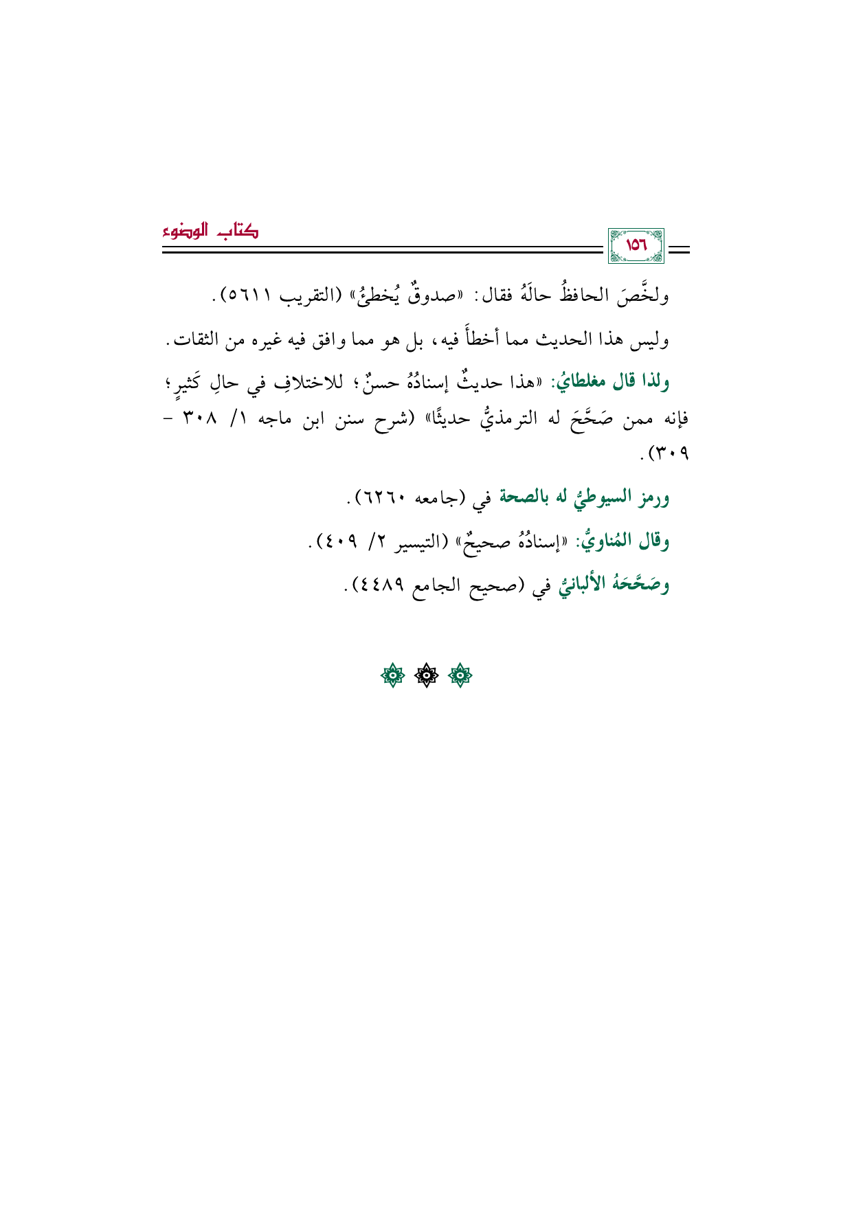 ولذا قال مغلطايُ: "هذا حديثٌ إسنادُهُ حسنٌ؛ للاختلافِ في حالِ كَثيرٍ؛ فإنه ممن صَحَّحَ له الترمذيُّ حديثًا" (شرح سنن ابن ماجه ١/ ٣٠٨ - ٣٠٩).