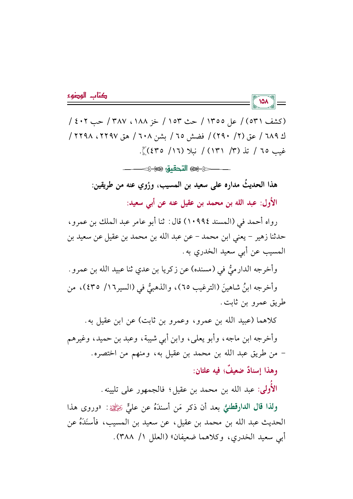 ولذا قال الدارقطنيُّ بعد أن ذكر مَن أسندَهُ عن عليٍّ رضي الله عنه: "وروى هذا الحديث عبد الله بن محمد بن عقيل، عن سعيد بن المسيب، فأسنَدَهُ عن أبي سعيد الخدري، وكلاهما ضعيفان" (العلل ١/ ٣٨٨).