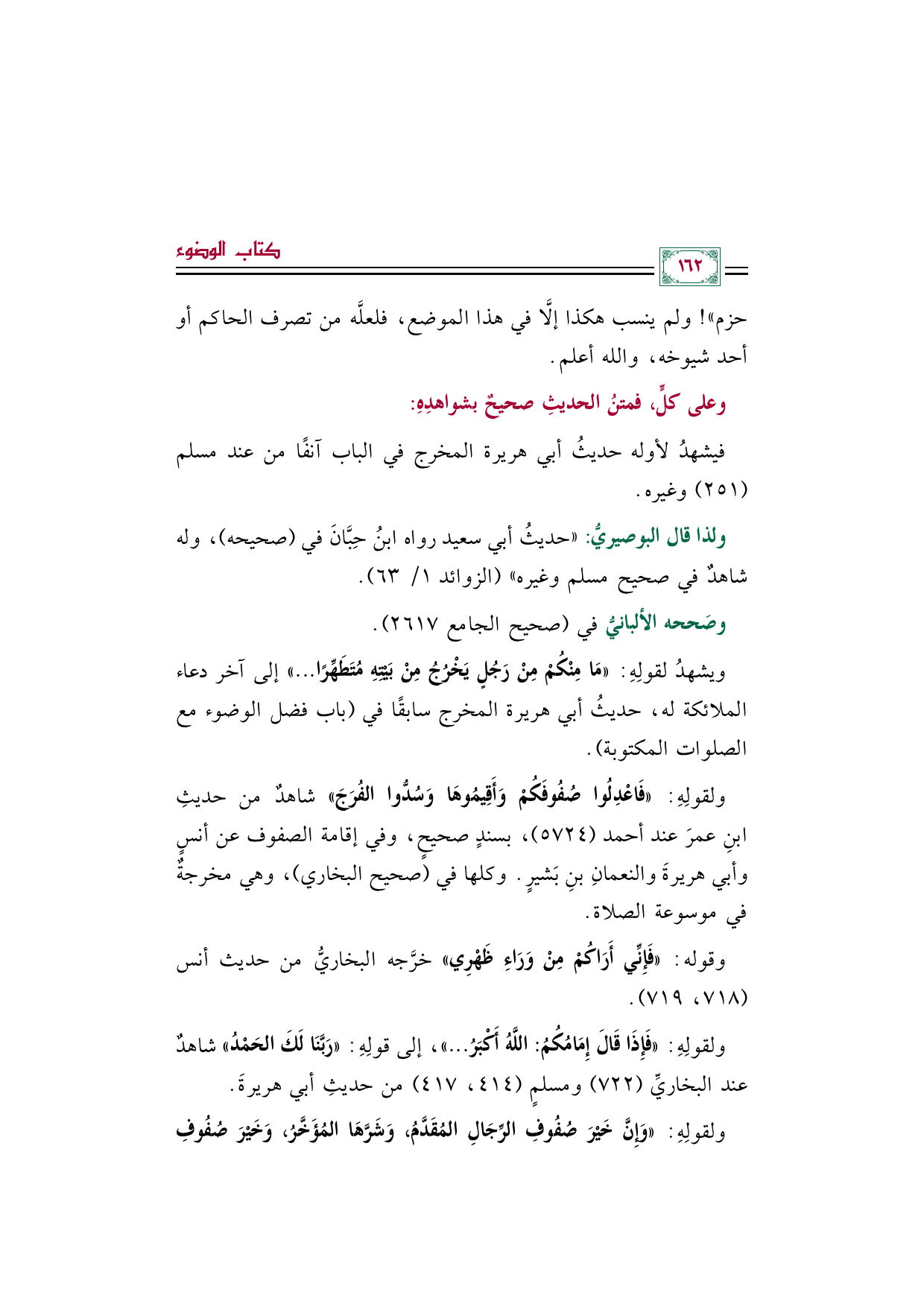 ولقولِهِ: «فَاعْدِلُوا صُفُوفَكُمْ وَأَقِيمُوهَا وَسُدُّوا الفُرَجَ» شاهدٌ من حديثِ ابنِ عمرَ عند أحمد (٥٧٢٤)، بسندٍ صحيحٍ، وفي إقامة الصفوف عن أنسٍ وأبي هريرةَ والنعمانِ بنِ بَشيرٍ. وكلها في (صحيح البخاري)، وهي مخرجةٌ في موسوعة الصلاة.