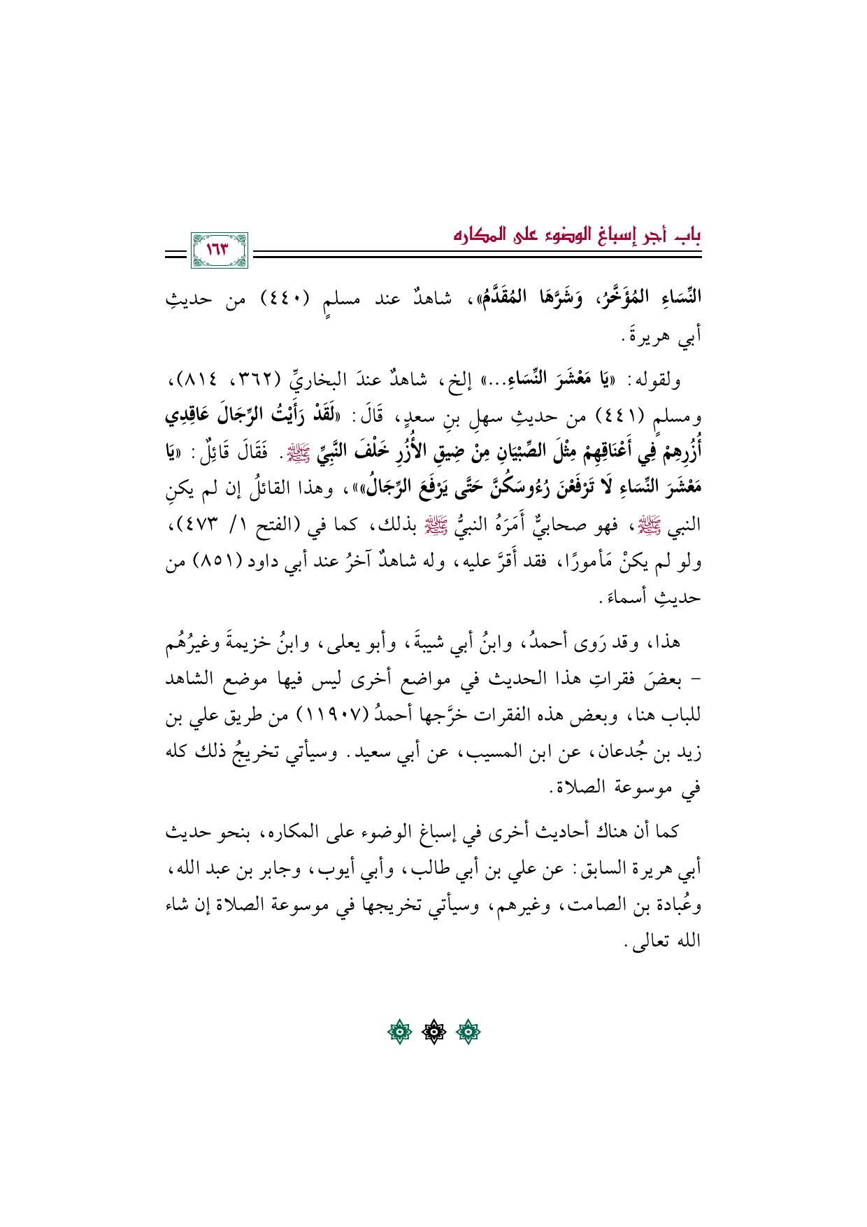 كما أن هناك أحاديث أخرى في إسباغ الوضوء على المكاره، بنحو حديث أبي هريرة السابق: عن علي بن أبي طالب، وأبي أيوب، وجابر بن عبد الله، وعُبادة بن الصامت، وغيرهم، وسيأتي تخريجها في موسوعة الصلاة إن شاء الله تعالى.
