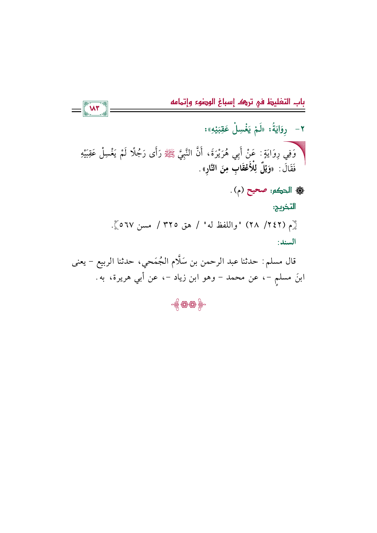 • وَفِي رِوَايَةٍ: عَنْ أَبِي هُرَيْرَةَ، أَنَّ النَّبِيَّ صلى الله عليه وسلم رَأَى رَجُلًا لَمْ يَغْسِلْ عَقِبَيْهِ فَقَالَ: «وَيْلٌ لِلْأَعْقَابِ مِنَ النَّارِ».