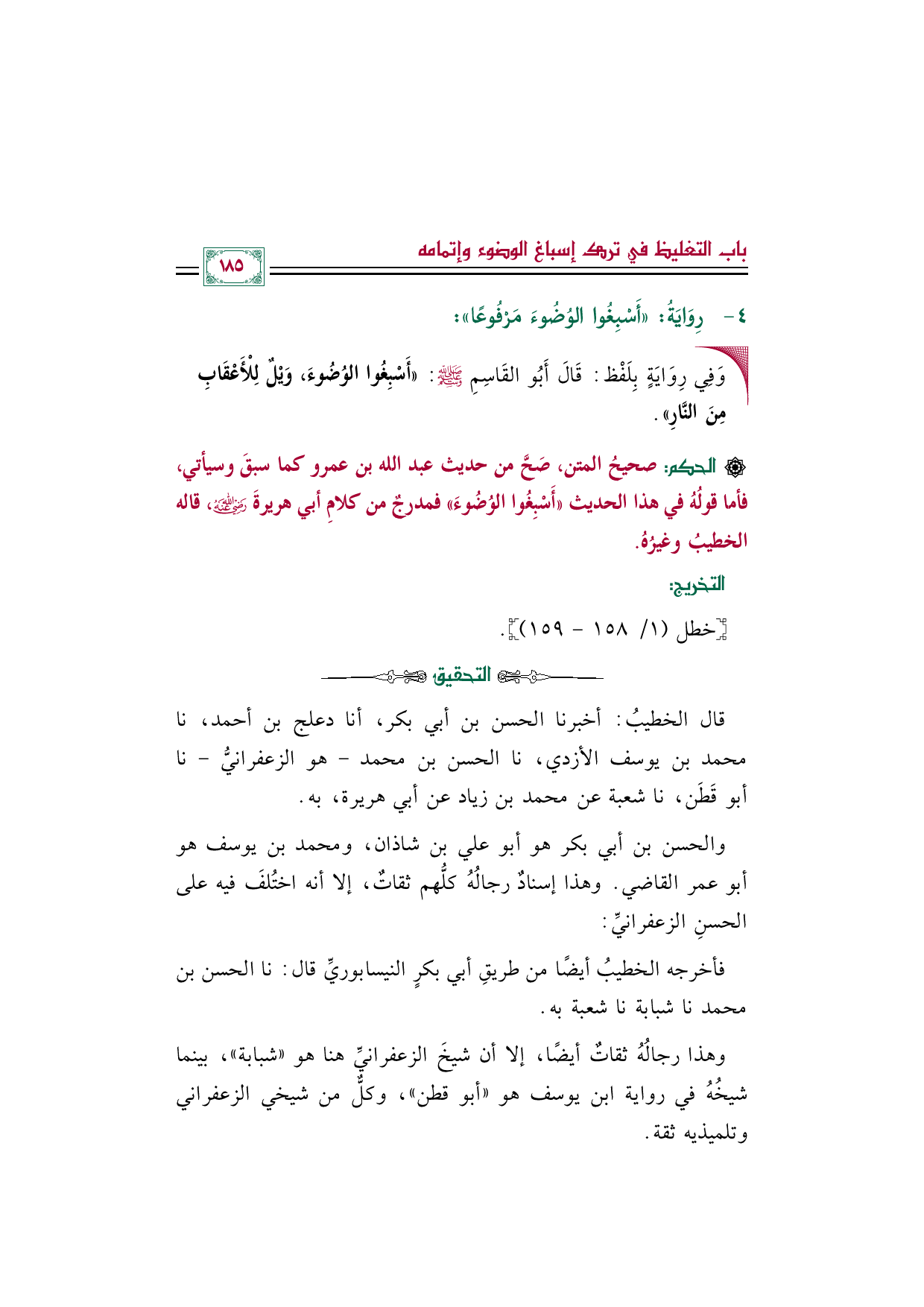 [الحكم]: صحيحُ المتن، صَحَّ من حديث عبد الله بن عمرو كما سبقَ وسيأتي، فأما قولُهُ في هذا الحديث «أَسْبِغُوا الوُضُوءَ» فمدرجٌ من كلامِ أبي هريرةَ رضي الله عنه، قاله الخطيبُ وغيرُهُ.