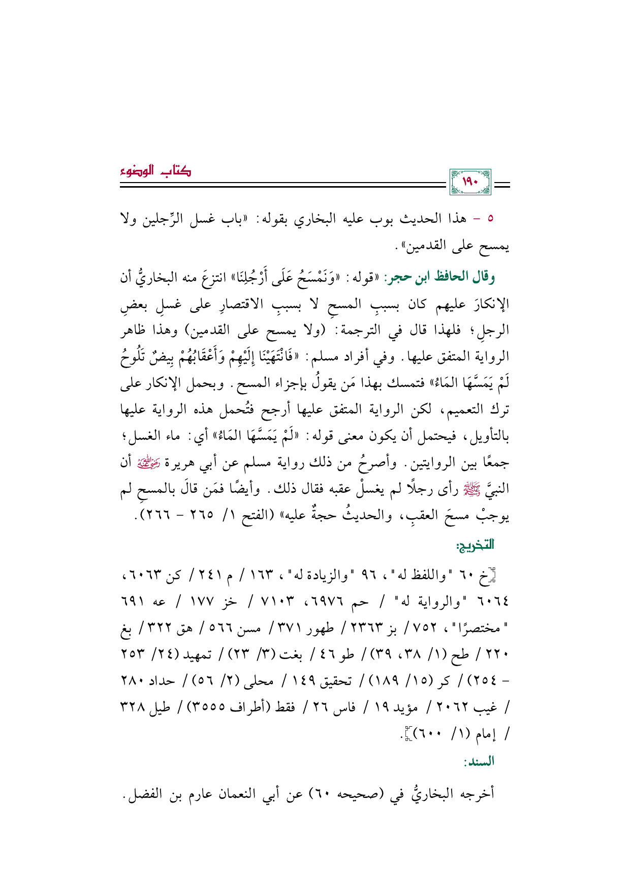 ٥ - هذا الحديث بوب عليه البخاري بقوله: "باب غسل الرِّجلين ولا يمسح على القدمين".