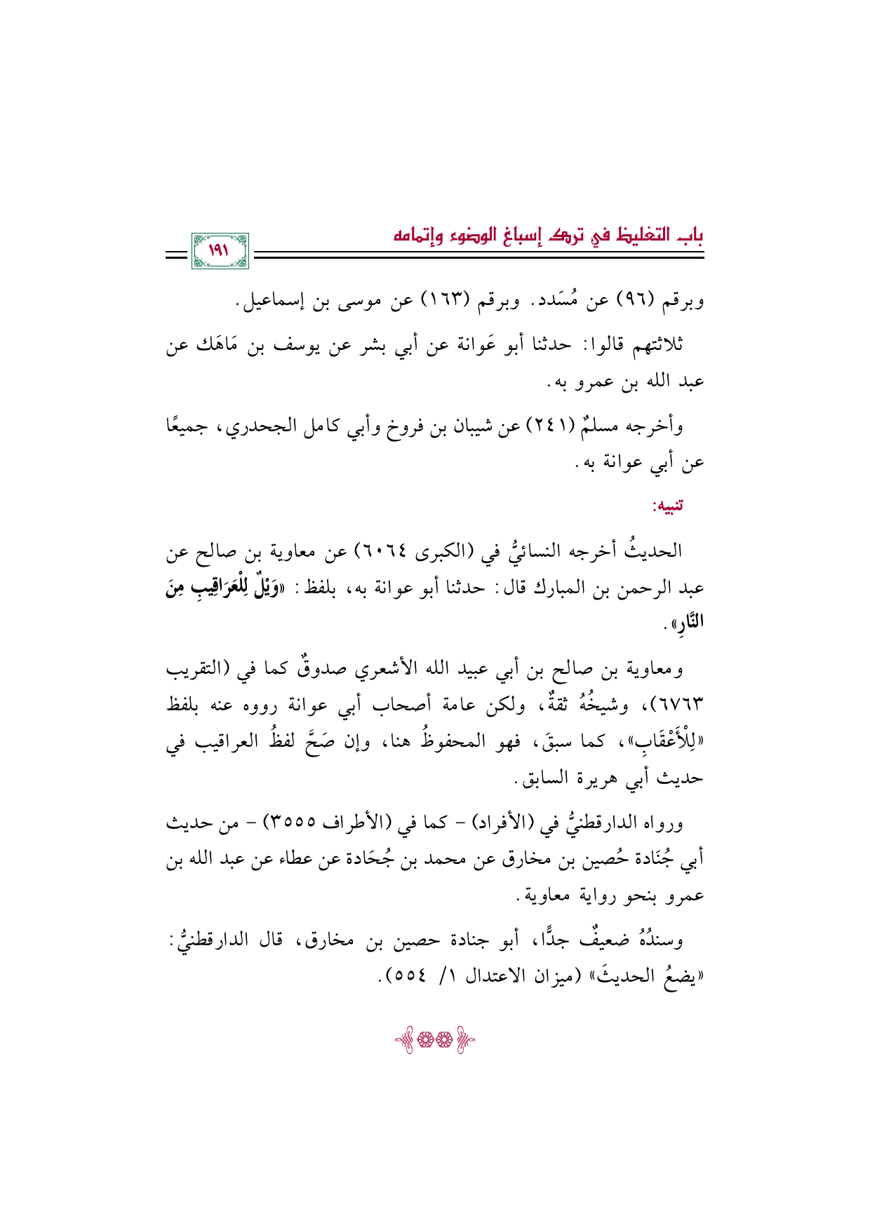 ومعاوية بن صالح بن أبي عبيد الله الأشعري صدوقٌ كما في (التقريب ٦٧٦٣)، وشيخُهُ ثقةٌ، ولكن عامة أصحاب أبي عوانة رووه عنه بلفظ «لِلْأَعْقَابِ»، كما سبقَ، فهو المحفوظُ هنا، وإن صَحَّ لفظُ العراقيب في حديث أبي هريرة السابق.
