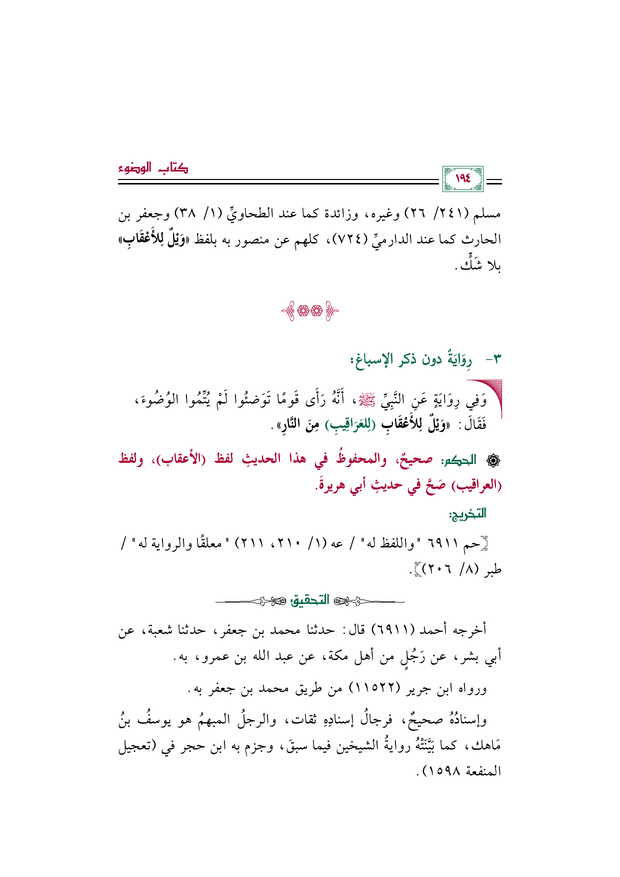 مسلم (٢٤١/ ٢٦) وغيره، وزائدة كما عند الطحاويِّ (١/ ٣٨) وجعفر بن الحارث كما عند الدارميِّ (٧٢٤)، كلهم عن منصور به بلفظ "وَيْلٌ لِلأَعْقَابِ" بلا شَكٍّ.