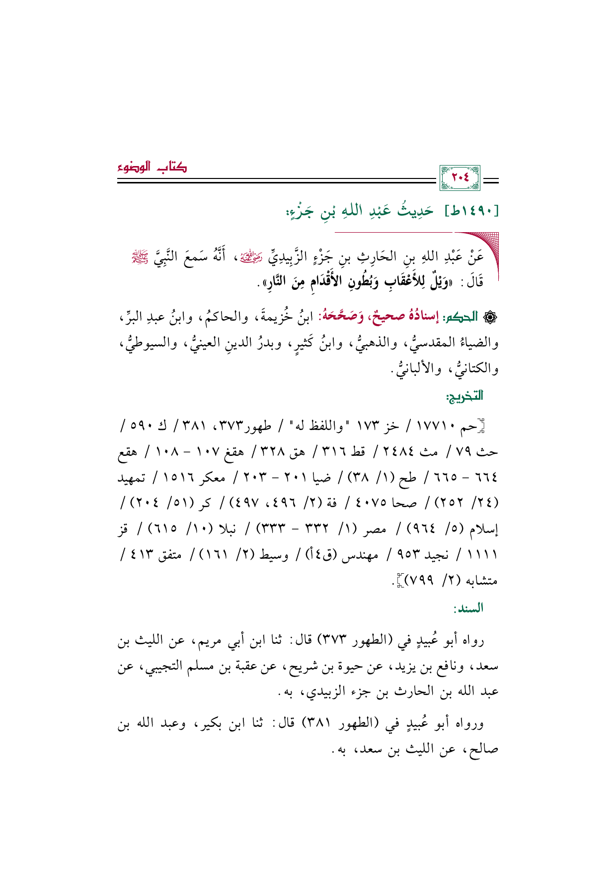 رواه أبو عُبيدٍ في (الطهور ٣٧٣) قال: ثنا ابن أبي مريم، عن الليث بن سعد، ونافع بن يزيد، عن حيوة بن شريح، عن عقبة بن مسلم التجيبي، عن عبد الله بن الحارث بن جزء الزبيدي، به.