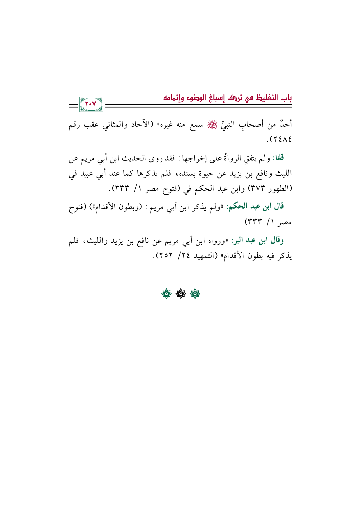 وقال ابن عبد البر: "ورواه ابن أبي مريم عن نافع بن يزيد والليث، فلم يذكر فيه بطون الأقدام" (التمهيد ٢٤/ ٢٥٢).